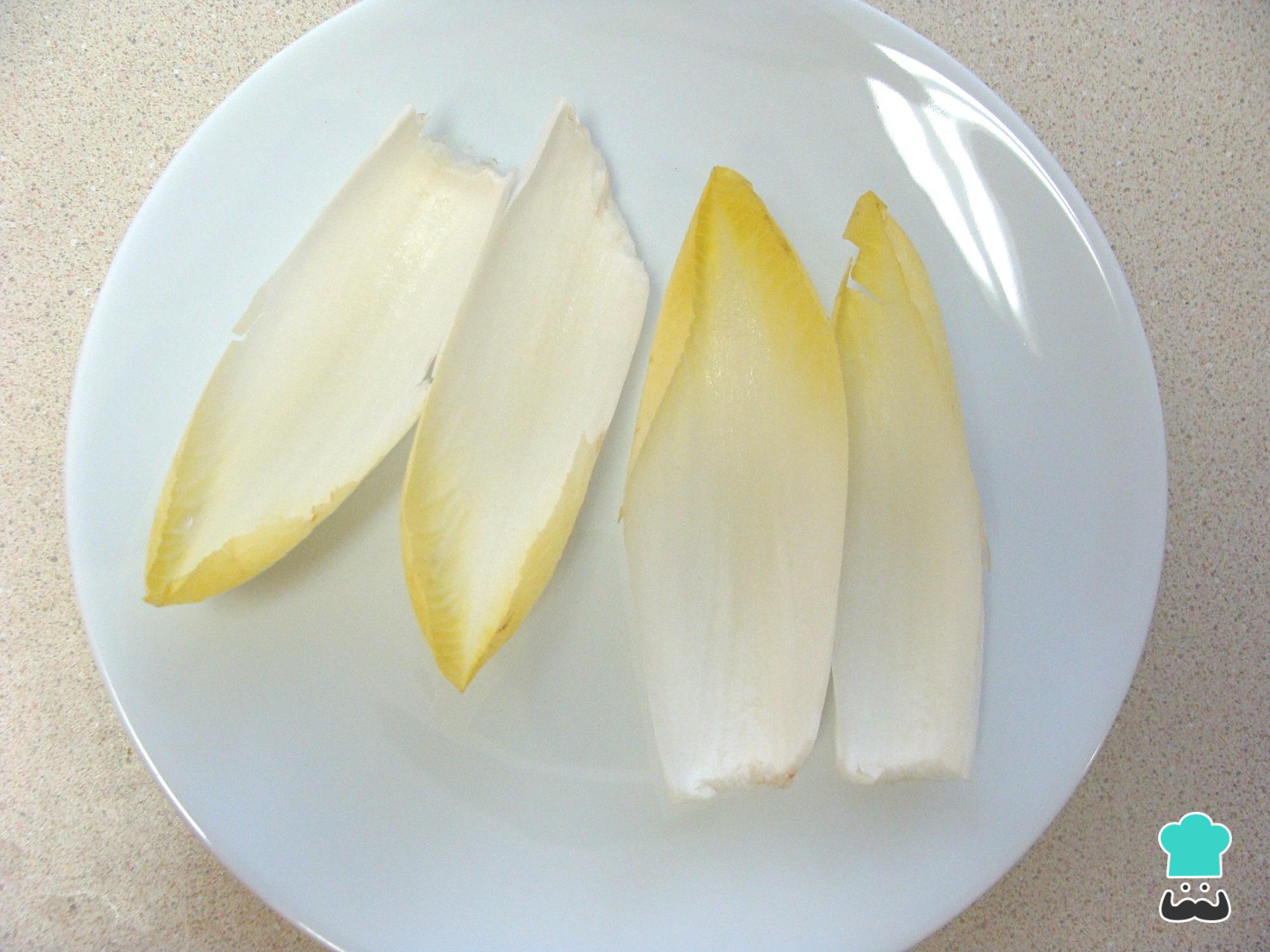 O primeiro passo desta receita especial é preparar as endívias: corte um pouco do pé, rejeite as folhas de fora e separe as restantes. Se necessário, lave e seque as folhas.