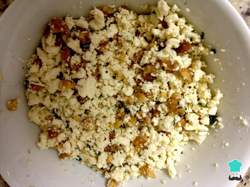 Em seguida prepare o recheio: corte o presunto em tirinhas pequenas ou quadrados, e misture com a ricota e as nozes (reserve um pouco para decorar). Tempere a gosto com sal e pimenta.
