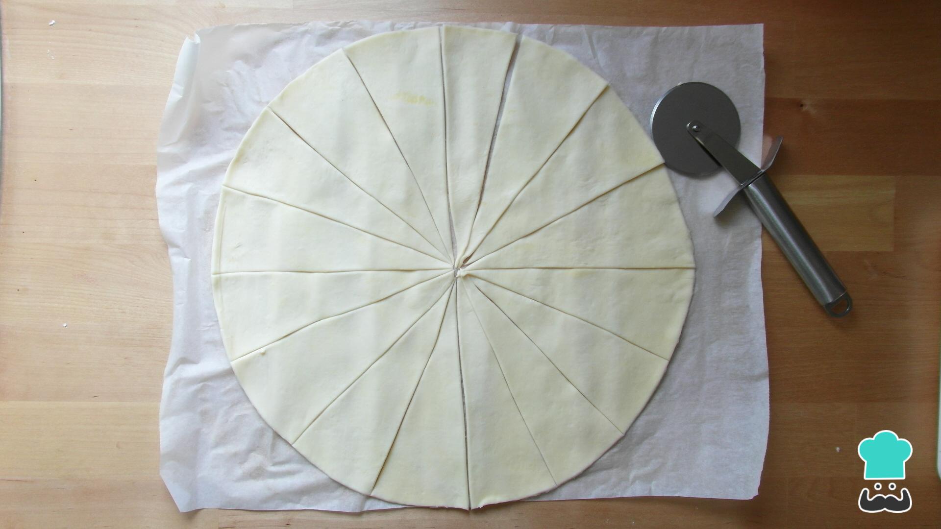 Modele a massa do enroladinho em forma de bola e abra com o rolo, de forma a obter um círculo. Usando uma faca ou cortador, corte em triângulos, como mostrado na fotografia.