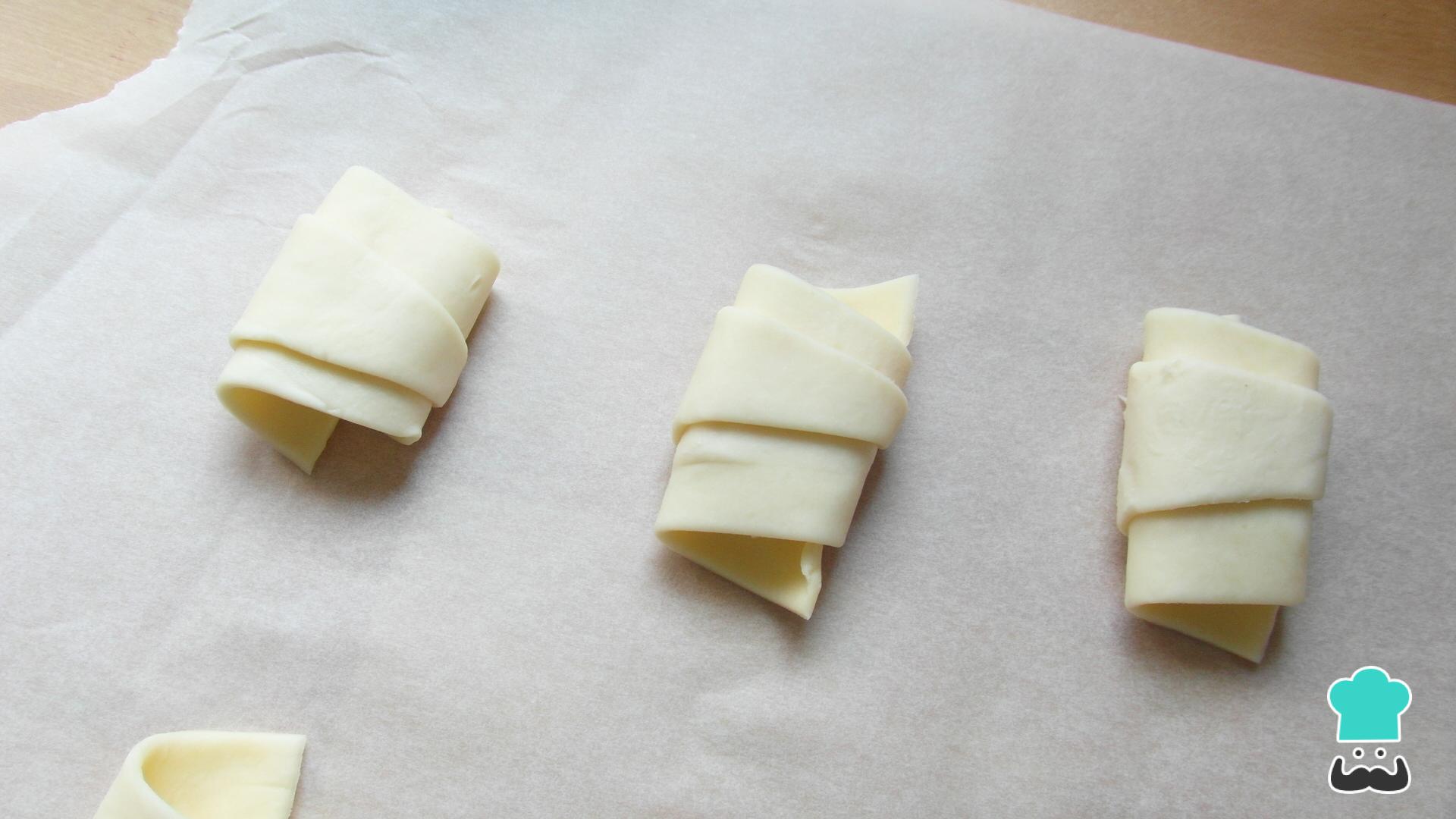Sobre a parte mais larga dos triângulos, coloque um pedaço de goiabada e enrole a partir daí, de forma a conseguir uma espécie de croissant. Coloque em um tabuleiro de forno untado ou com papel manteiga, e leve a assar no forno preaquecido a 180ºC por cerca de 35 minutos.