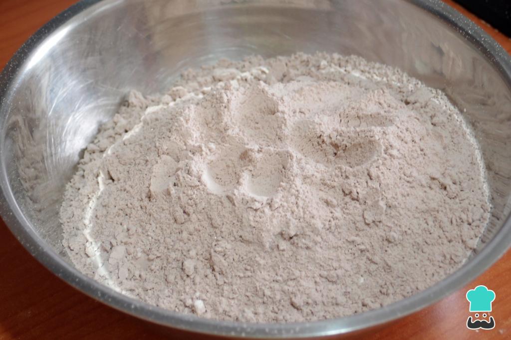 Comece por preparar a massa desse enroladinho: misture em uma vasilha a farinha, o açúcar, o fermento e o sal e, noutro recipiente, o leite, o óleo e os ovos. Acrescente os ingredientes líquidos aos secos e misture muito bem.
