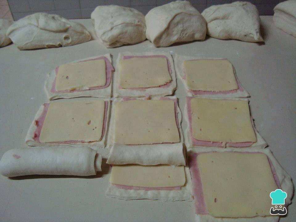 Corte a massa em quadrados do tamanho do queijo e do presunto e coloque uma fatia de cada sobre a massa. Enrole como um rocambole e pincele com o ovo batido, para que fique brilhante depois de assar.