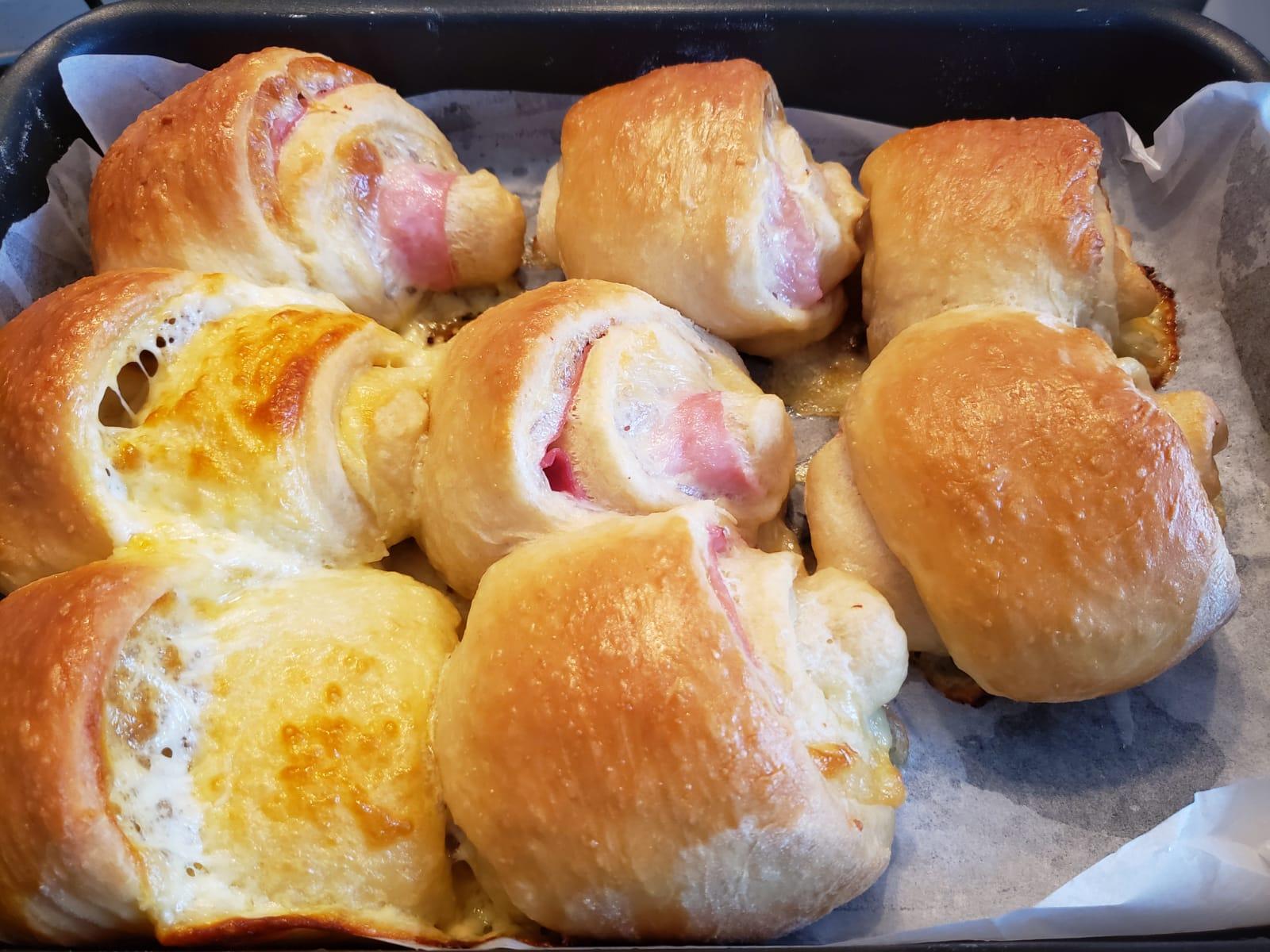 Leve os enroladinhos de queijo e presunto a assar no forno preaquecido a 180ºC por 30-40 minutos, ou até crescerem e dourarem. Espere esfriar antes de servir e bom apetite!