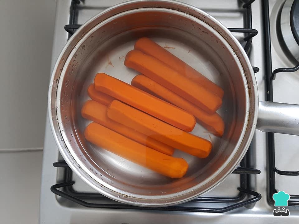 Antes de preparar os enroladinhos, ferva as salsichas inteiras por 5 minutos, apenas para retirar o excesso de corante das mesmas.