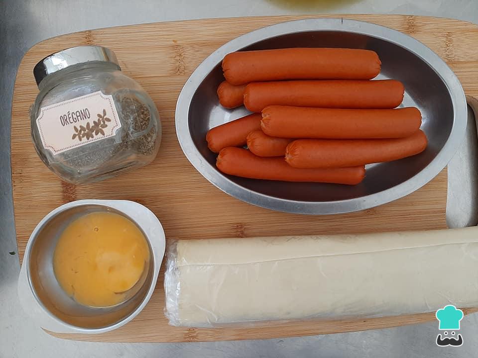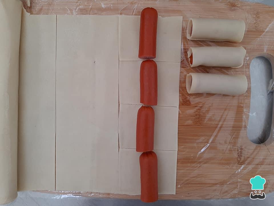 Abra o rolo da massa de pastel e, com uma faca, corte retângulos (aproximadamente com medida de 6 x 4 cm). Acomode as salsichas em cada retângulo e enrole-as como um rocambole.