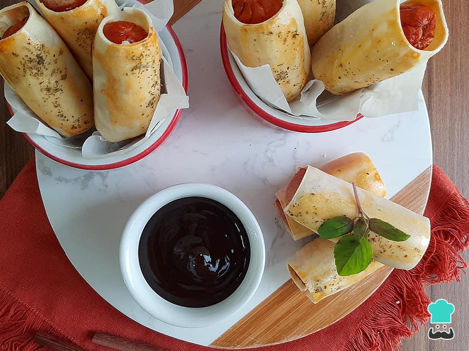 Como fazer Enroladinho de salsicha com massa de pastel assado: