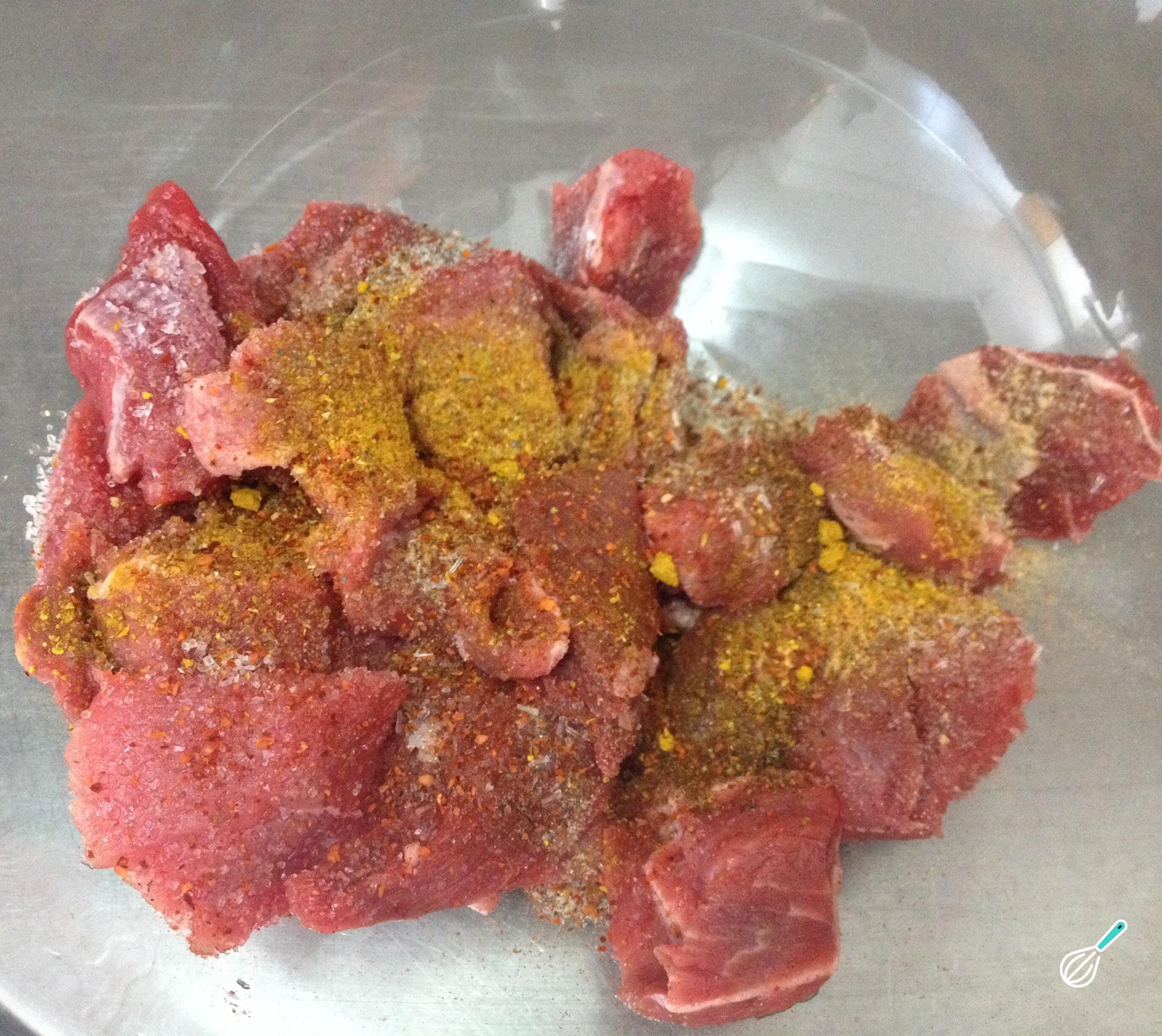 Corte a carne em pedaços pequenos e tempere com sal, pimenta, metade do curry, a pimenta malagueta e o cardamomo.