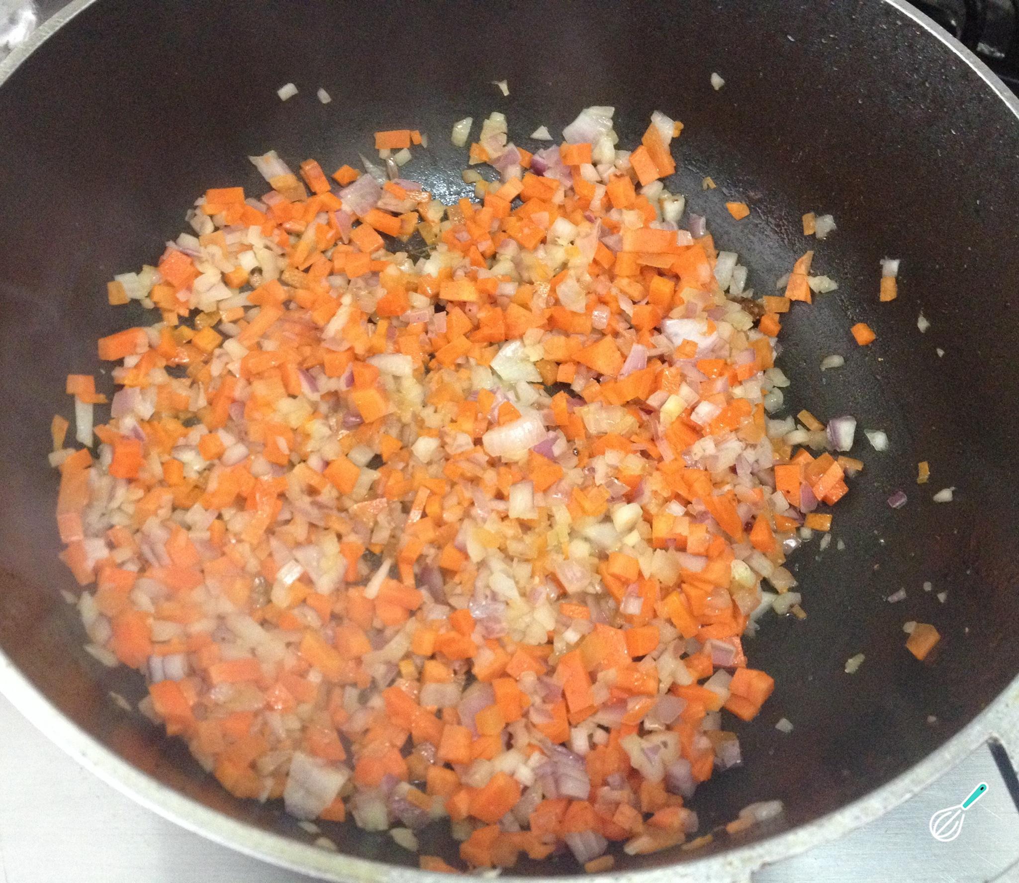 Na mesma panela adicione a cebola e cenoura em cubos pequenos, tempere com sal e pimenta e cozinhe por 5 minutos. Junte o gengibre e o alho finamente picados, baixe o fogo, tampe e deixe cozinhar por mais 5 minutos.