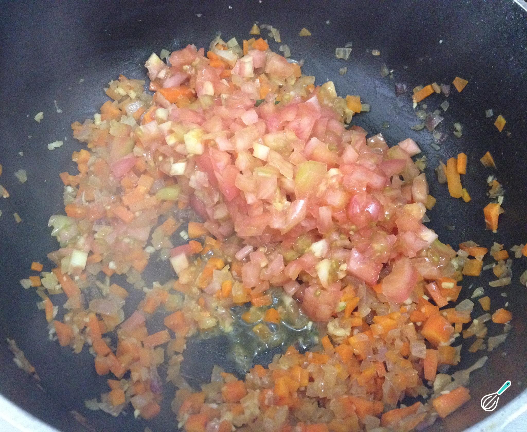 Coloque agora o tomate, cortado em cubos pequenos e sem pele. Cozinhe tampado até que os tomates comecem libertando seu suco.