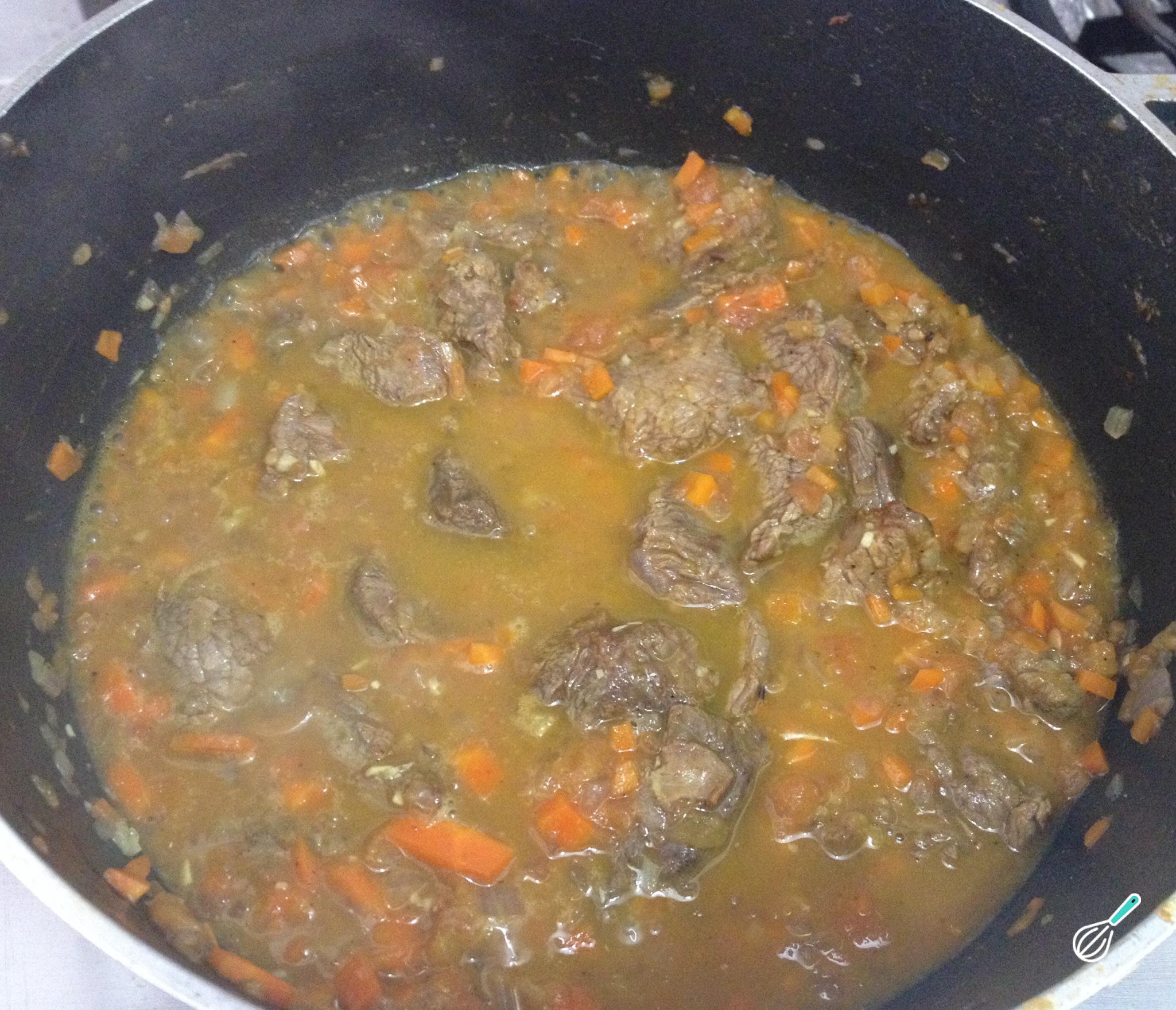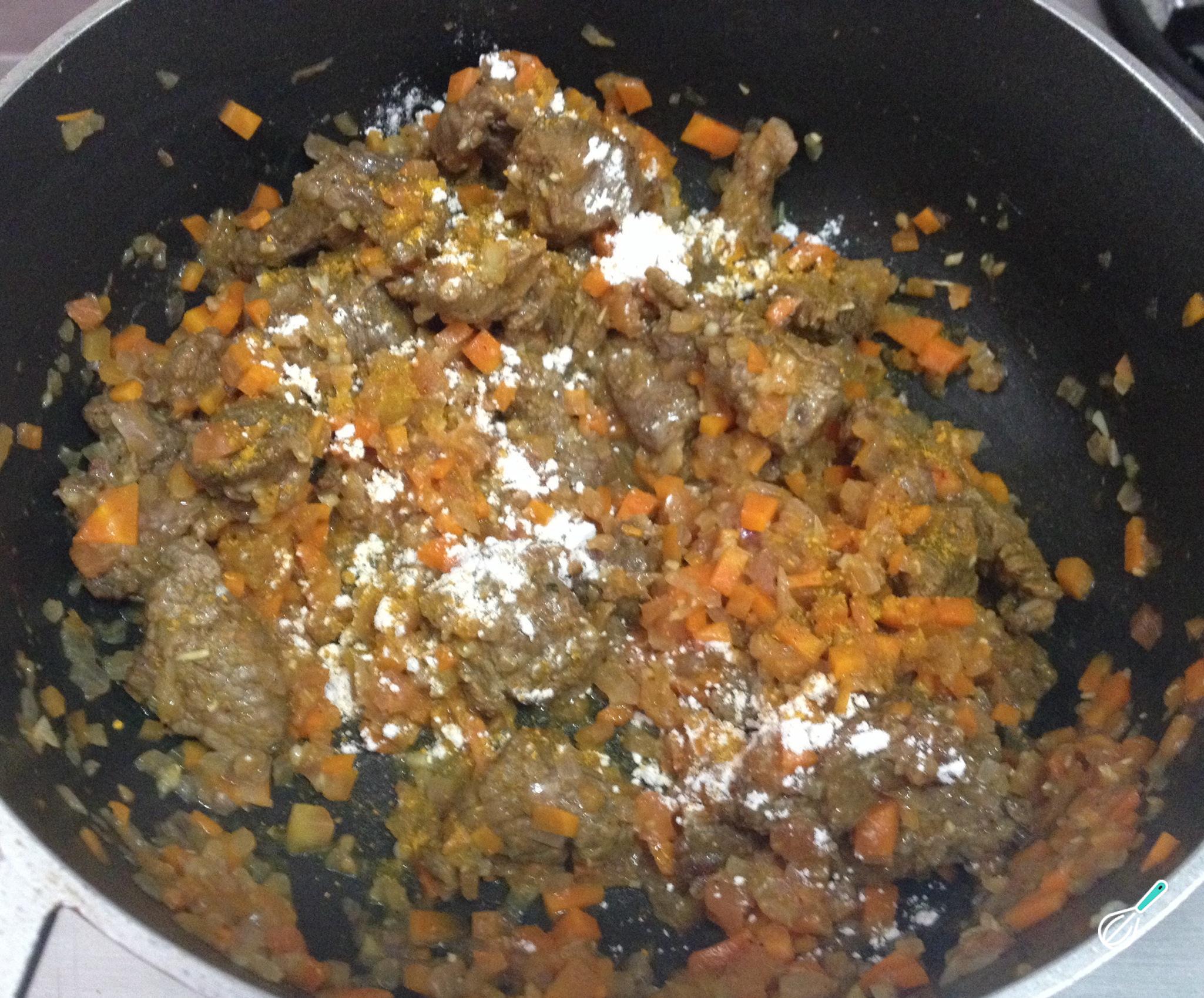 Adicione os pedaços de carne, a farinha e o resto do caril. Mexa por 2 minutos em fogo baixo.