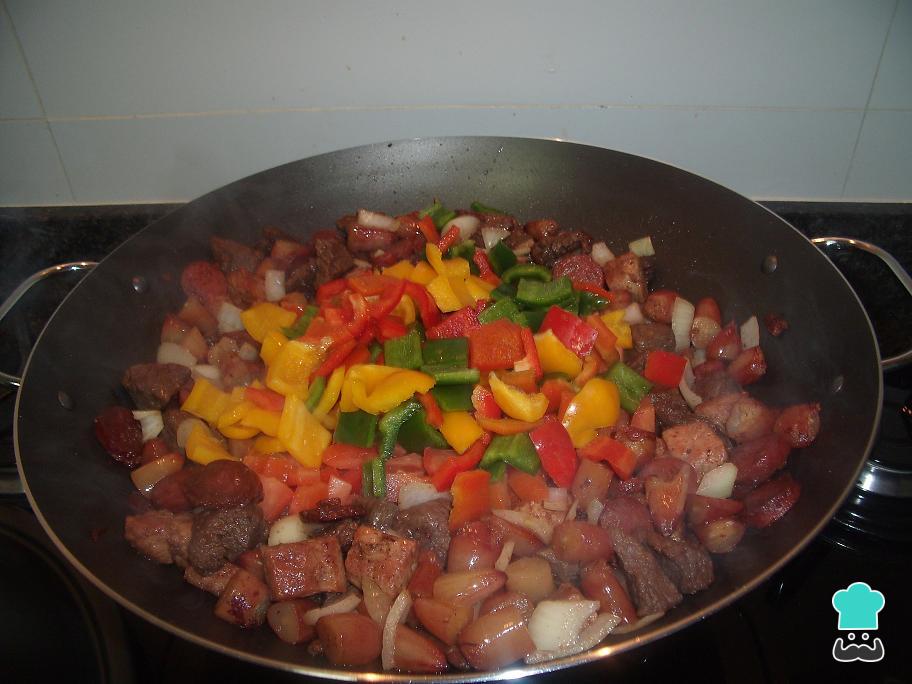 Quando todas as carnes estiverem cozinhadas, é hora de adicionar os legumes. Tempere com sal e pimenta, misture tudo e cozinhe até que fiquem ligeiramente dourados.