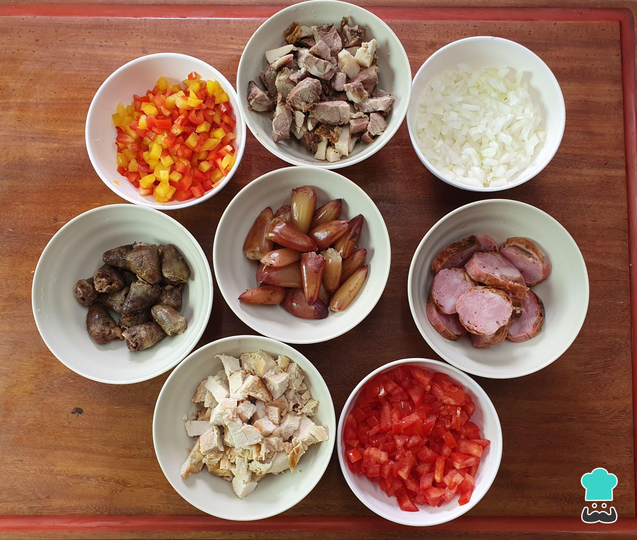 Pique as carnes em cubos pequenos (use todas as sobras de carnes do seu churrasco) e separe os demais ingredientes. Se houver sobras de outros vegetais da geladeira, poderá acrescentar também!