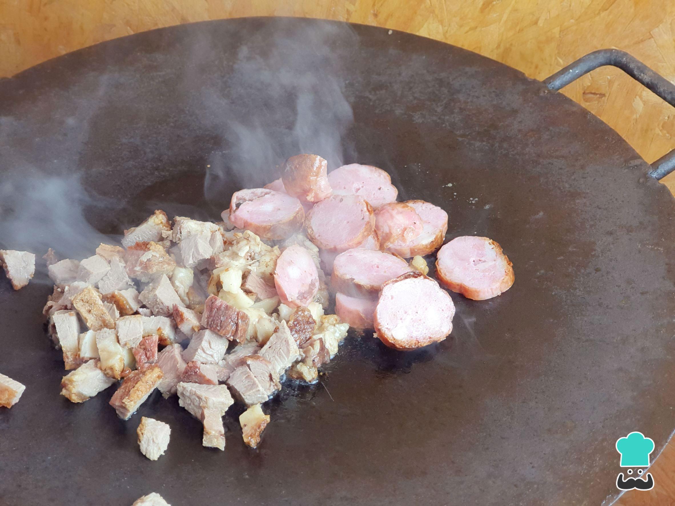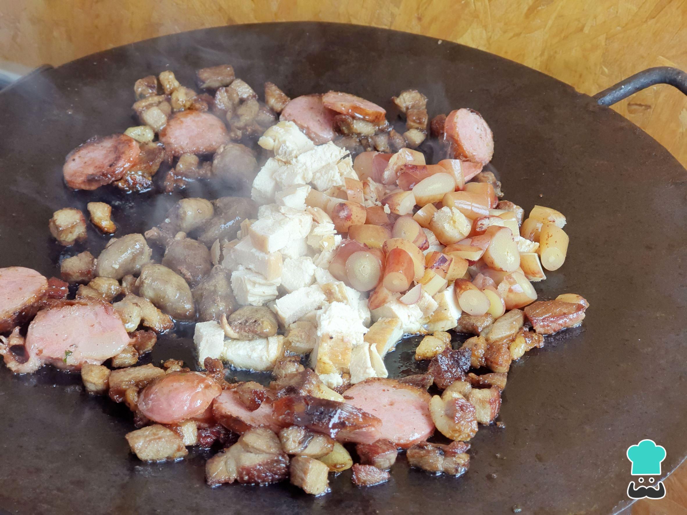Quando as primeiras carnes começarem a dourar e grudar no fundo, arraste-as para as bordas da frigideira e acrescente as outras carnes mais leves, como o frango, e também o pinhão. Mexa até que doure e acrescente um fio de óleo sempre que for necessário.