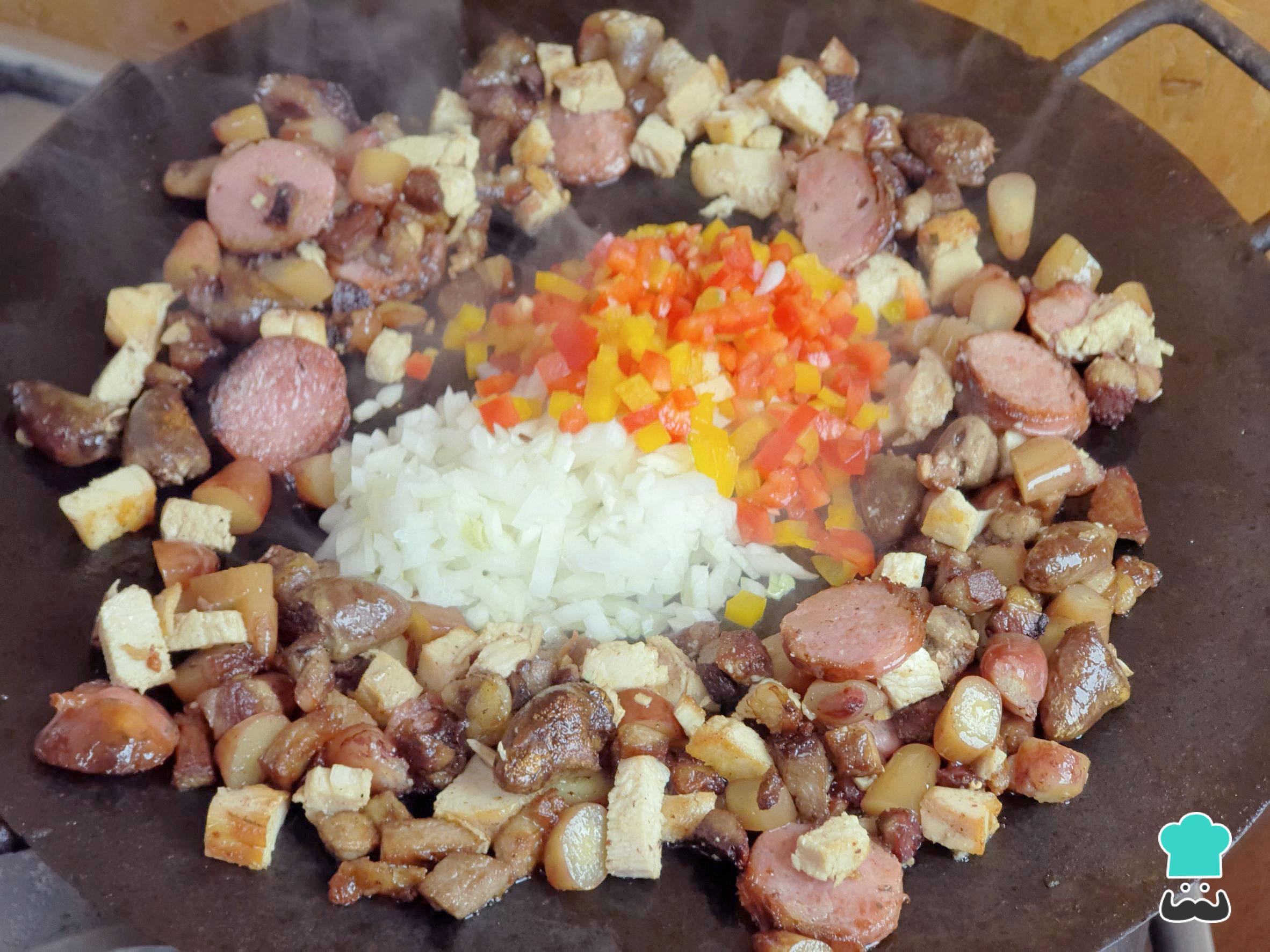 Após alguns minutos repita o mesmo processo, arrastando as carnes já douradas para as bordas da frigideira. Acrescente a cebola e os pimentões com um pouco mais de óleo, se for necessário. Espere dourar bem e misture estes temperos com as carnes.