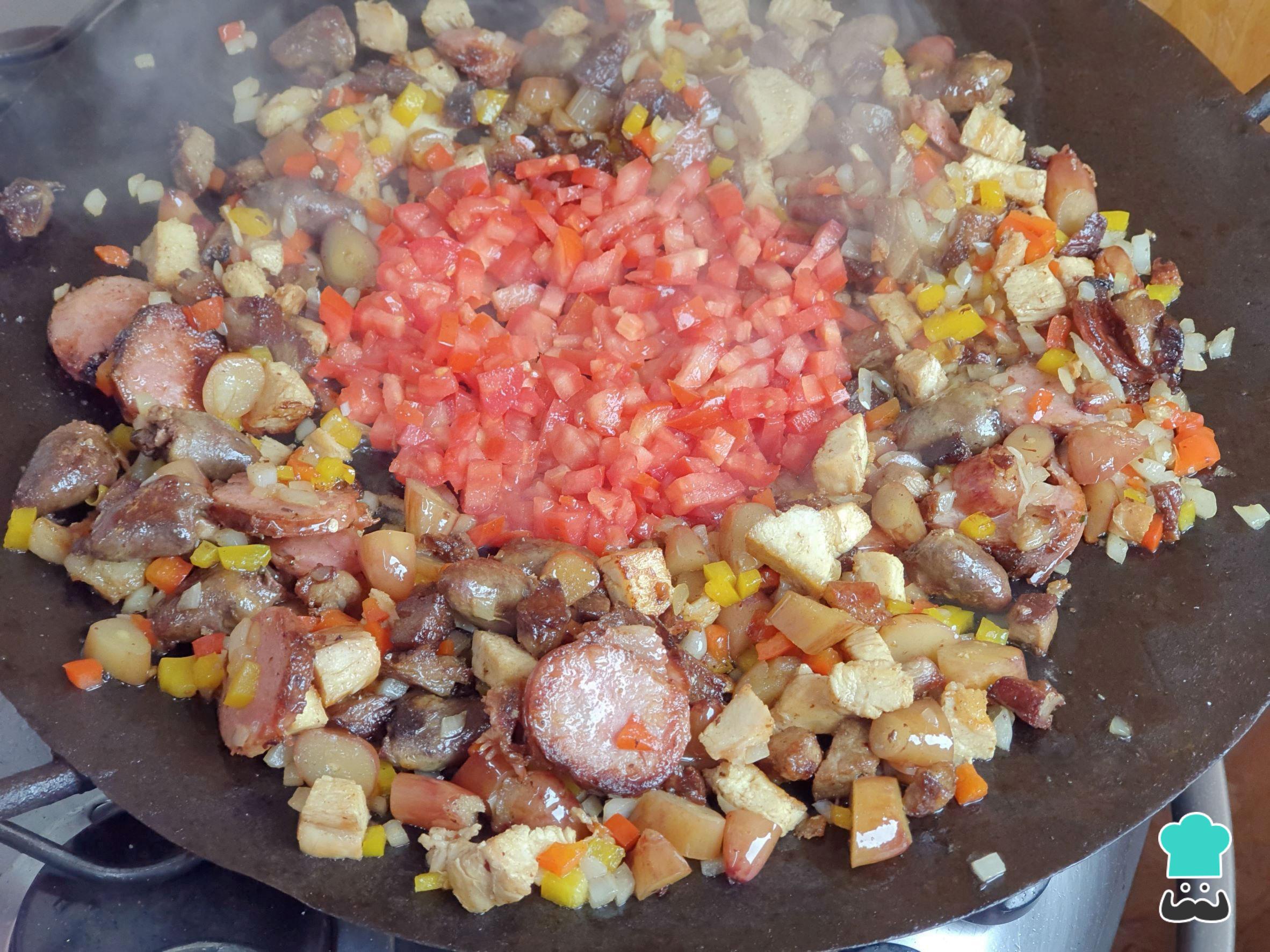 O passo seguinte desta receita de entrevero gaúcho é acrescentar o tomate, incorporando-o com as carnes. Espere até que o tomate fique macio, acerte o sal e tempere com pimenta, se assim desejar.