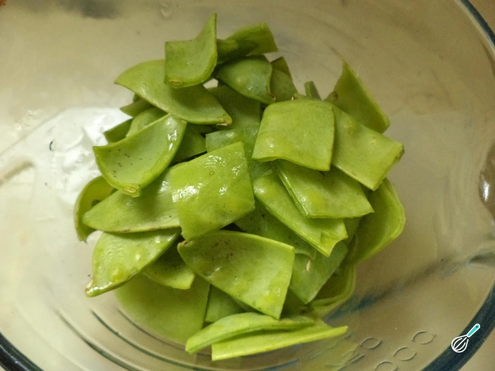 Em seguida, junte a cebola e o alho picados e refogue por mais 3 minutos. Adicione a ervilha torta cortada em pedaços e tempere com sal e pimenta do reino a gosto. Cozinhe até a ervilha amaciar (cerca de 5 minutos).