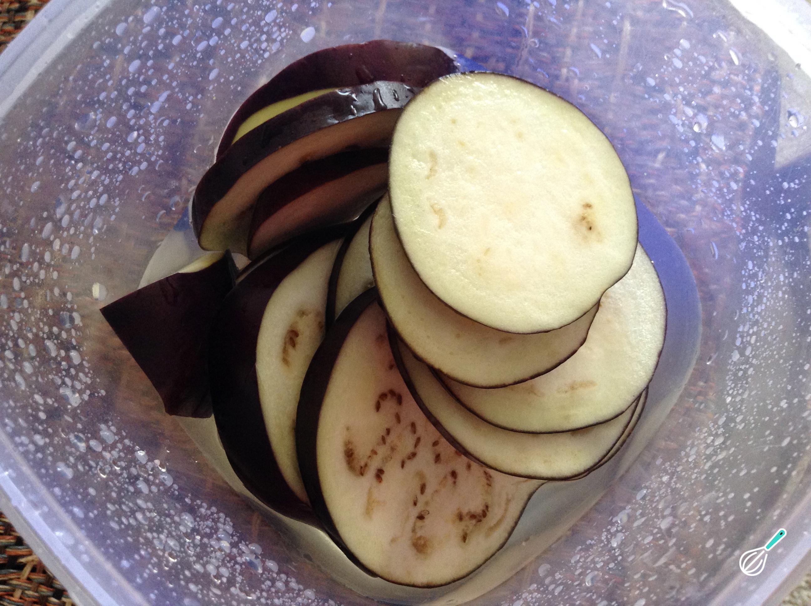 Corte a berinjela em fatias e coloque em uma tigela. Cubra com água, reserve durante 30 minutos e escorra.