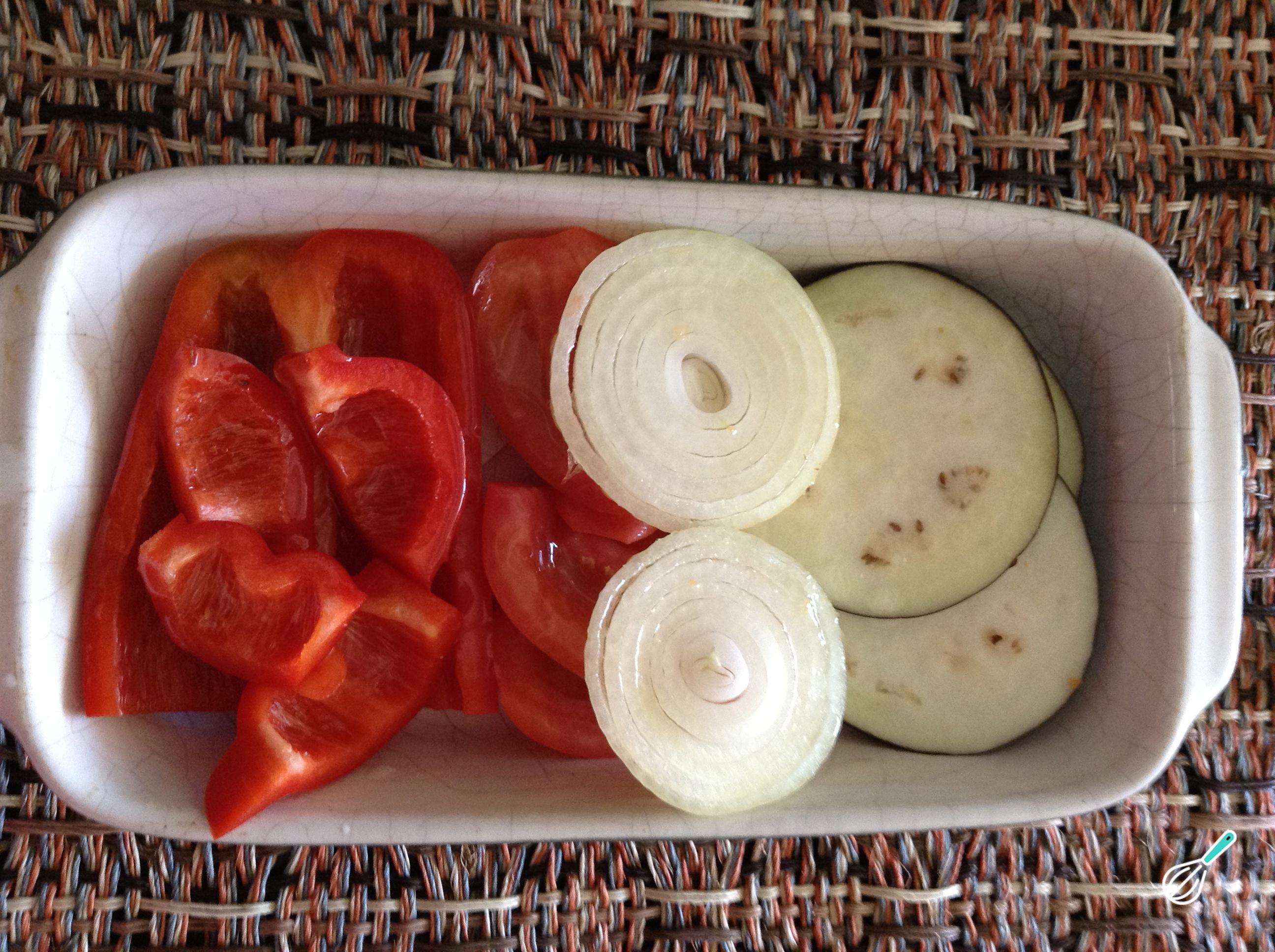 Lave e corte os pimentões, as cebolas e os tomates (sem sementes). Coloque em um refratário junto com as berinjelas, regue com 3 colheres de sopa de azeite e tempere com sal e pimenta a gosto.