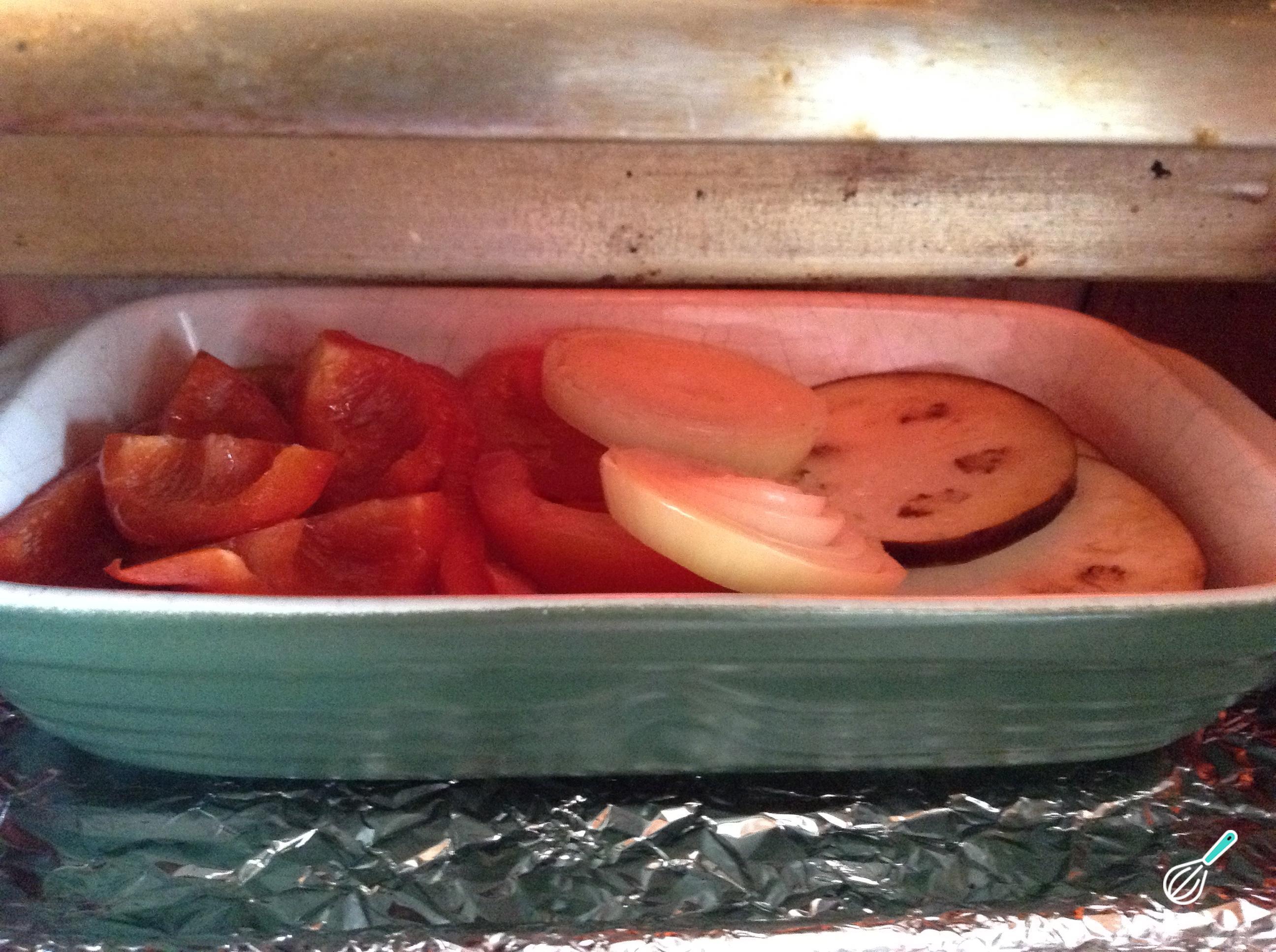 Leve a escalivada de legumes a assar no forno preaquecido a 160ºC por 10-15 minutos.