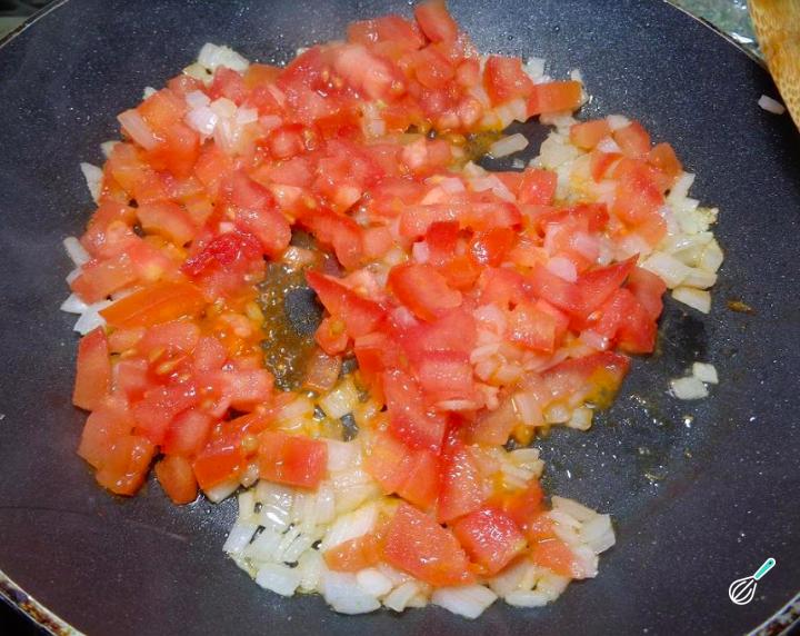Enquanto as batatas estiverem cozinhando pique a cebola, o alho e os tomates. Em seguida, em uma frigideira, refogue esses ingredientes com o azeite e, em seguida, adicione o bacalhau.