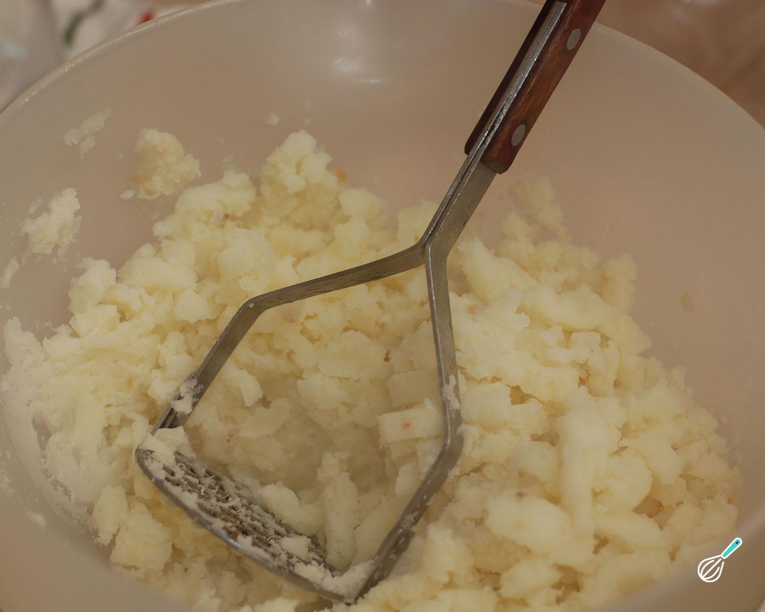 Escorra as batatas e amasse bem com um espremedor. Na mesma panela adicione o leite, a manteiga, as batatas amassadas e misture bem. Adicione sal, pimenta-do-reino e noz moscada a gosto.