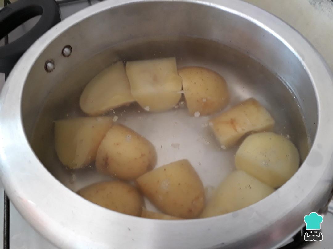 Primeiramente cozinhe as batatas na panela de pressão por 5 minutos (conte após começar a chiar).