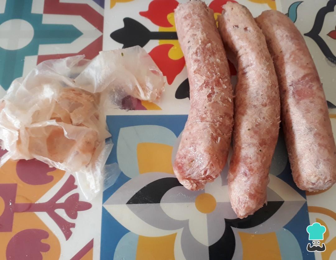 Em seguida prepare o recheio deste escondidinho de batata e linguiça começando por retirar as peles das linguiças.