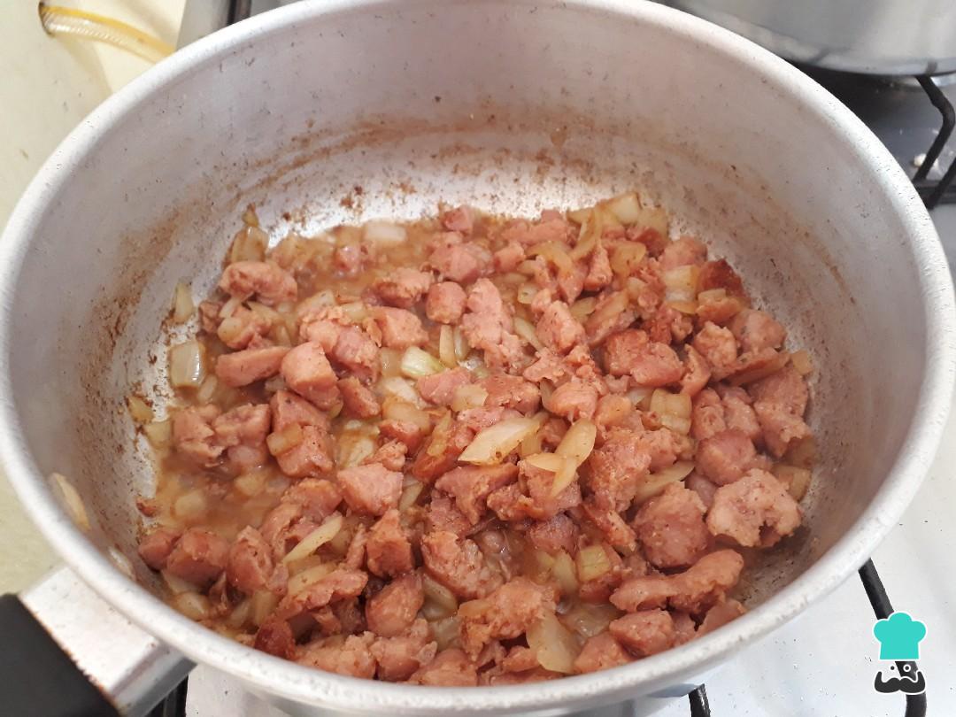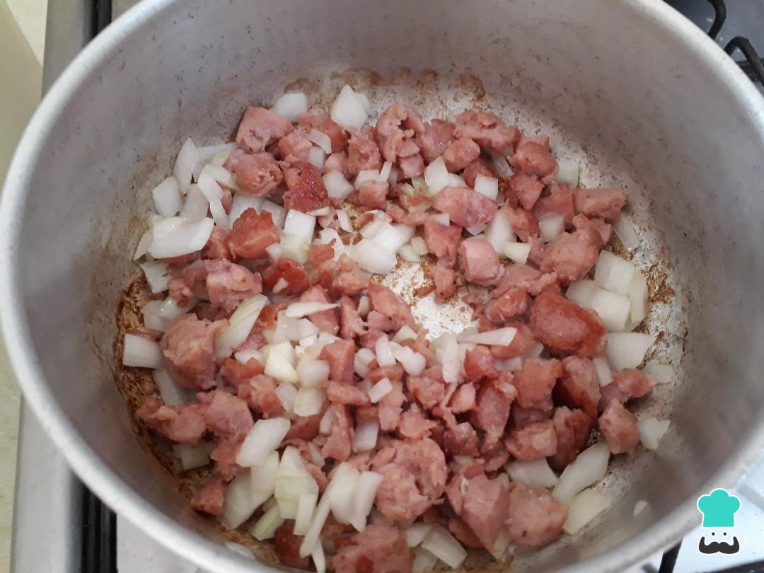 Pique as linguiças e frite com um pouquinho de azeite. Quando o fundo da panela estiver bem dourado, adicione a cebola e mexa bem.