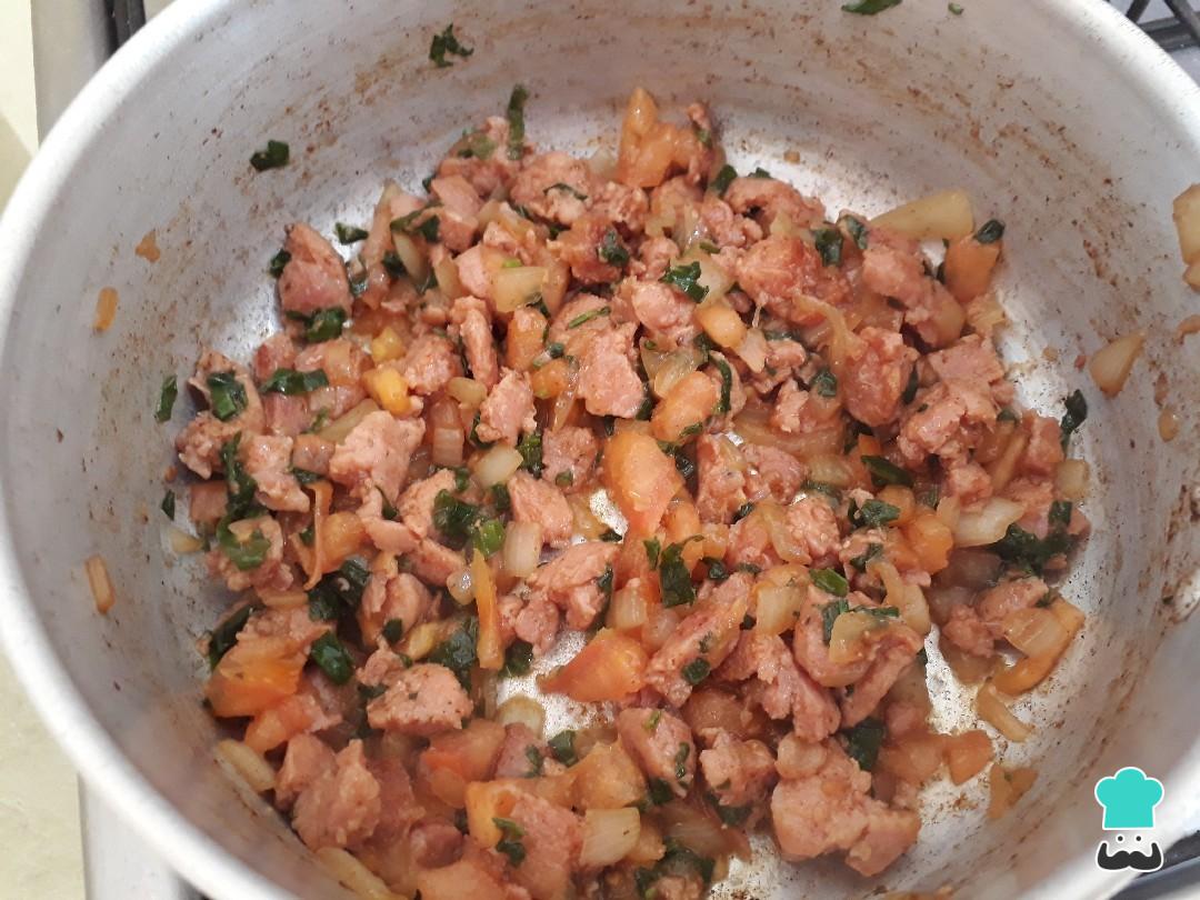 Depois pingue um pouquinho de água, para o fundinho dourado da panela soltar e dar sabor ao nosso recheio.