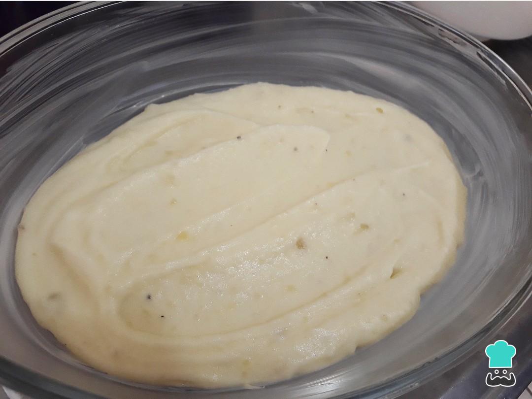 Finalmente, para a montagem do escondidinho unte um recipiente de vidro com manteiga e despeje metade do purê nele.