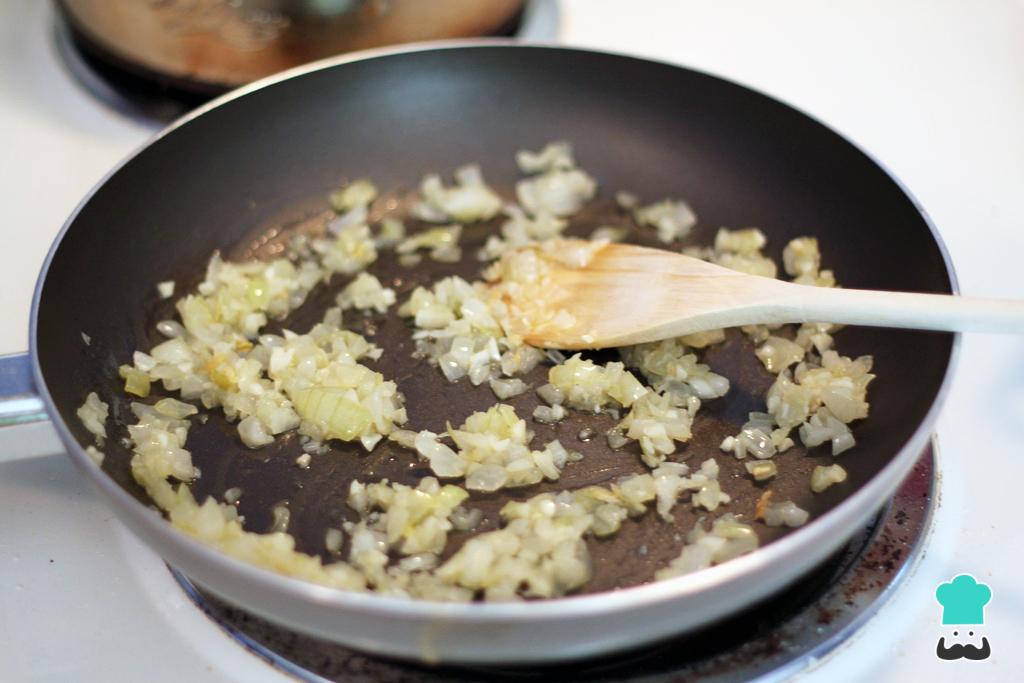 Em uma frigideira doure a cebola e o alho. Em seguida coloque o tomate picado, deixe cozinhar um pouco e acrescente a calabresa. Coloque a pimenta e os temperos que escolher. Não coloque nada muito salgado, porque a calabresa já é salgada. Não deixe fritar, apenas refogue.