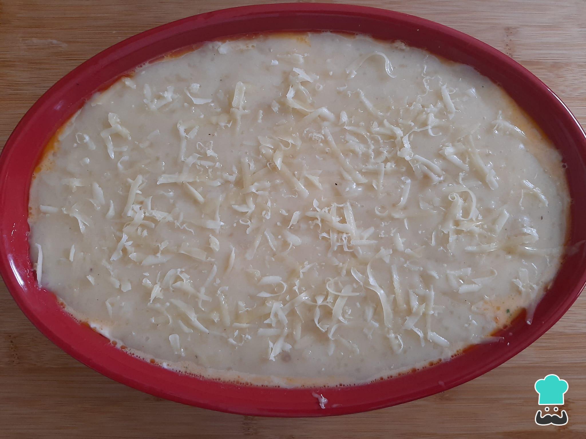 Num refratário médio, untado com manteiga ou azeite de oliva, acomode metade do purê de aipim.