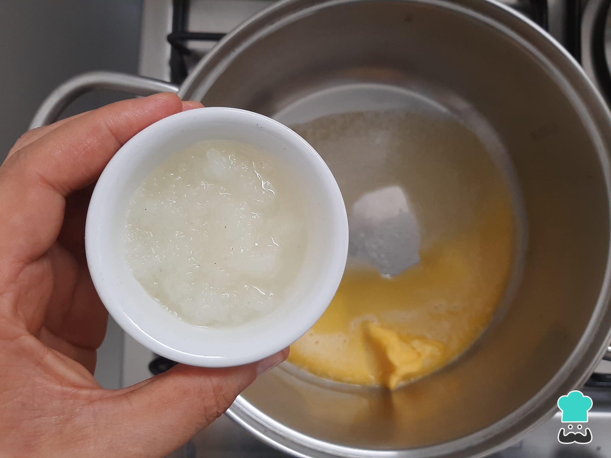 Numa panela média, derreta a manteiga e adicione a cebola ralada, refogando rapidamente em fogo brando.