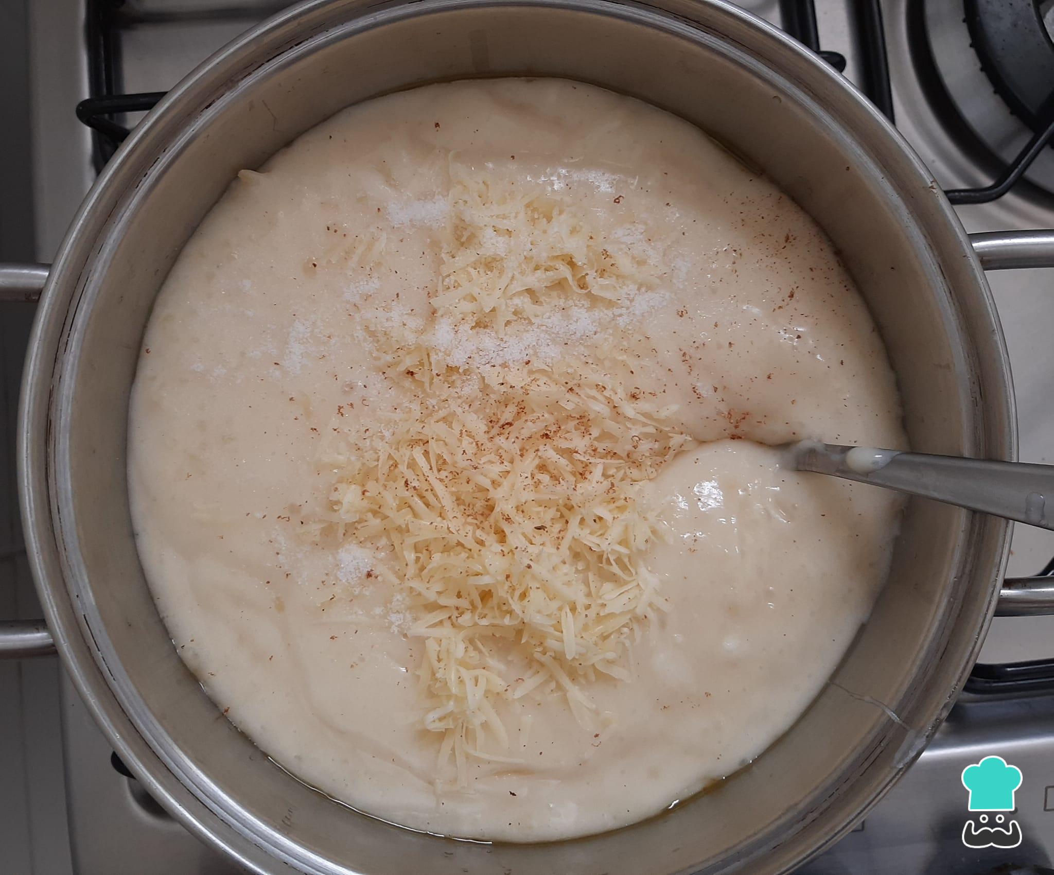 Adicione o creme de aipim ao refogado e tempere-o com sal, pimenta do reino e noz moscada ralada. Acrescente queijo parmesão ralado e misture bem.