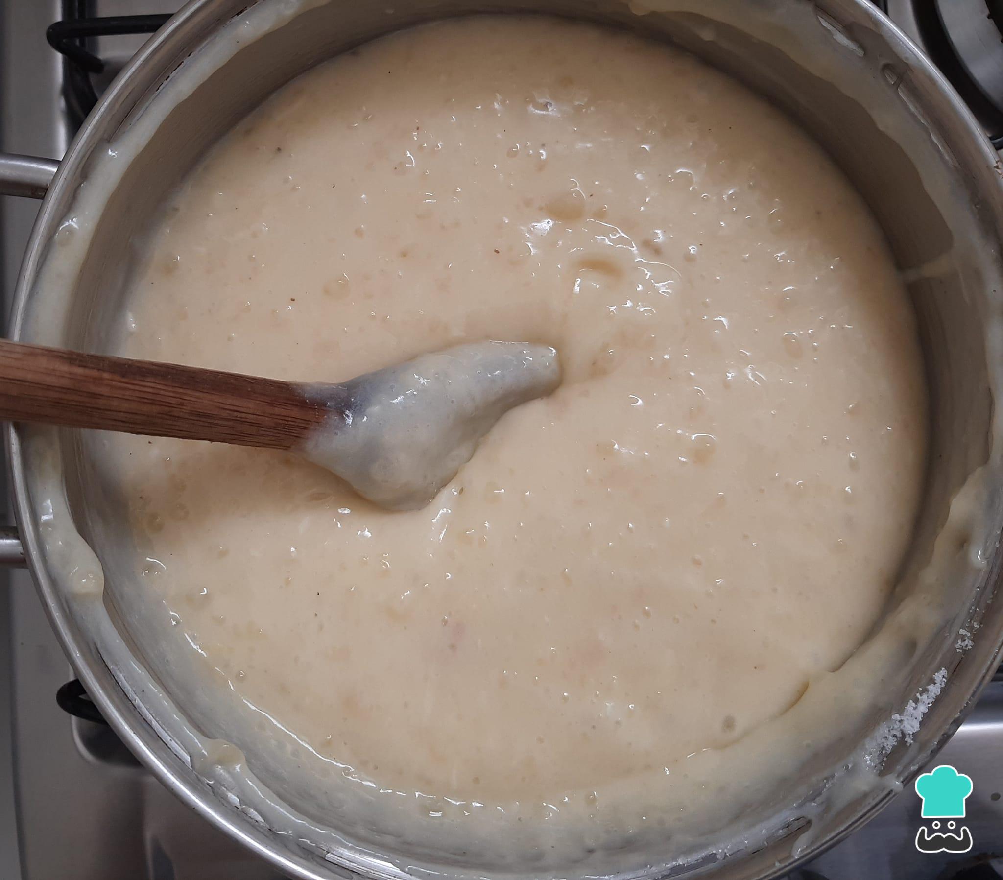 Deixe esse purê cozinhando por cerca de 10 minutos, mexendo sempre, para não grudar no fundo da panela. Após esse tempo, desligue o fogo e reserve-o.