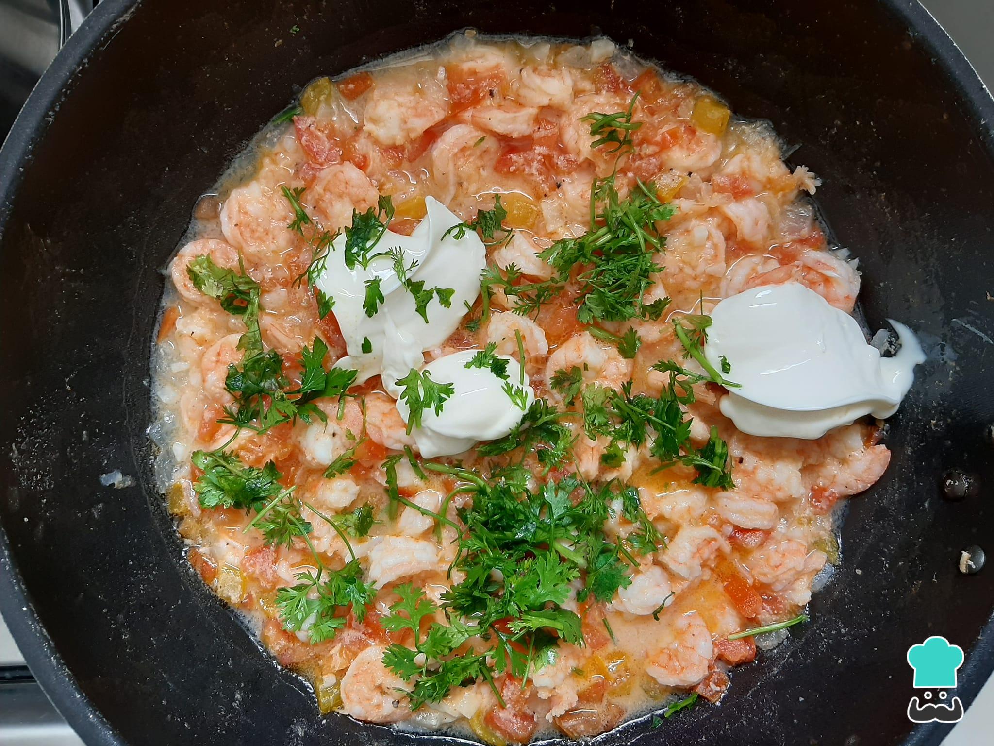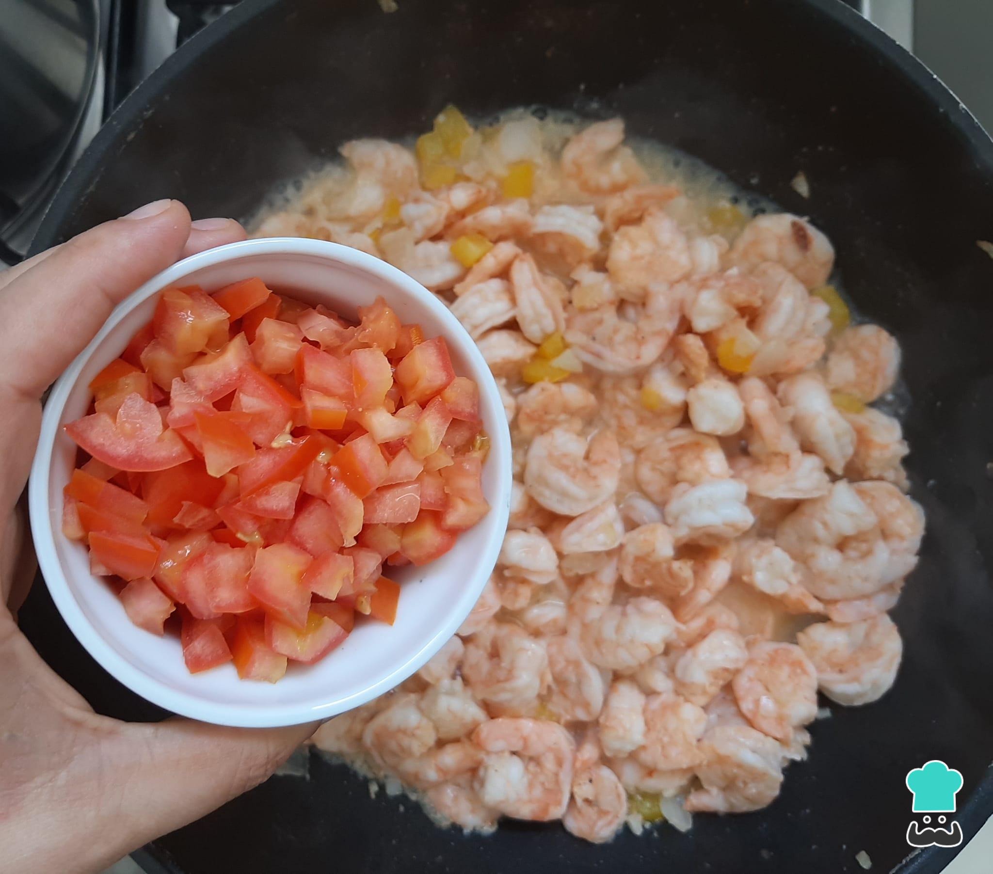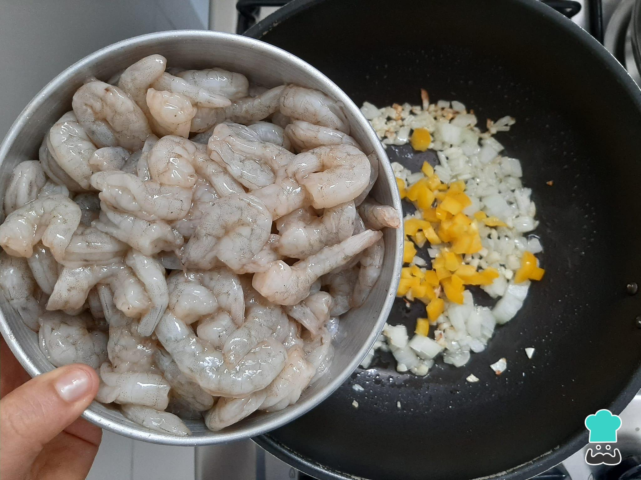 Em seguida prepare o recheio, primeiro aquecendo o azeite de oliva numa frigideira média e, em seguida, refogando a cebola, o alho e o pimentão picados. Depois adicione os camarões limpos e refogue por mais 5 minutos.