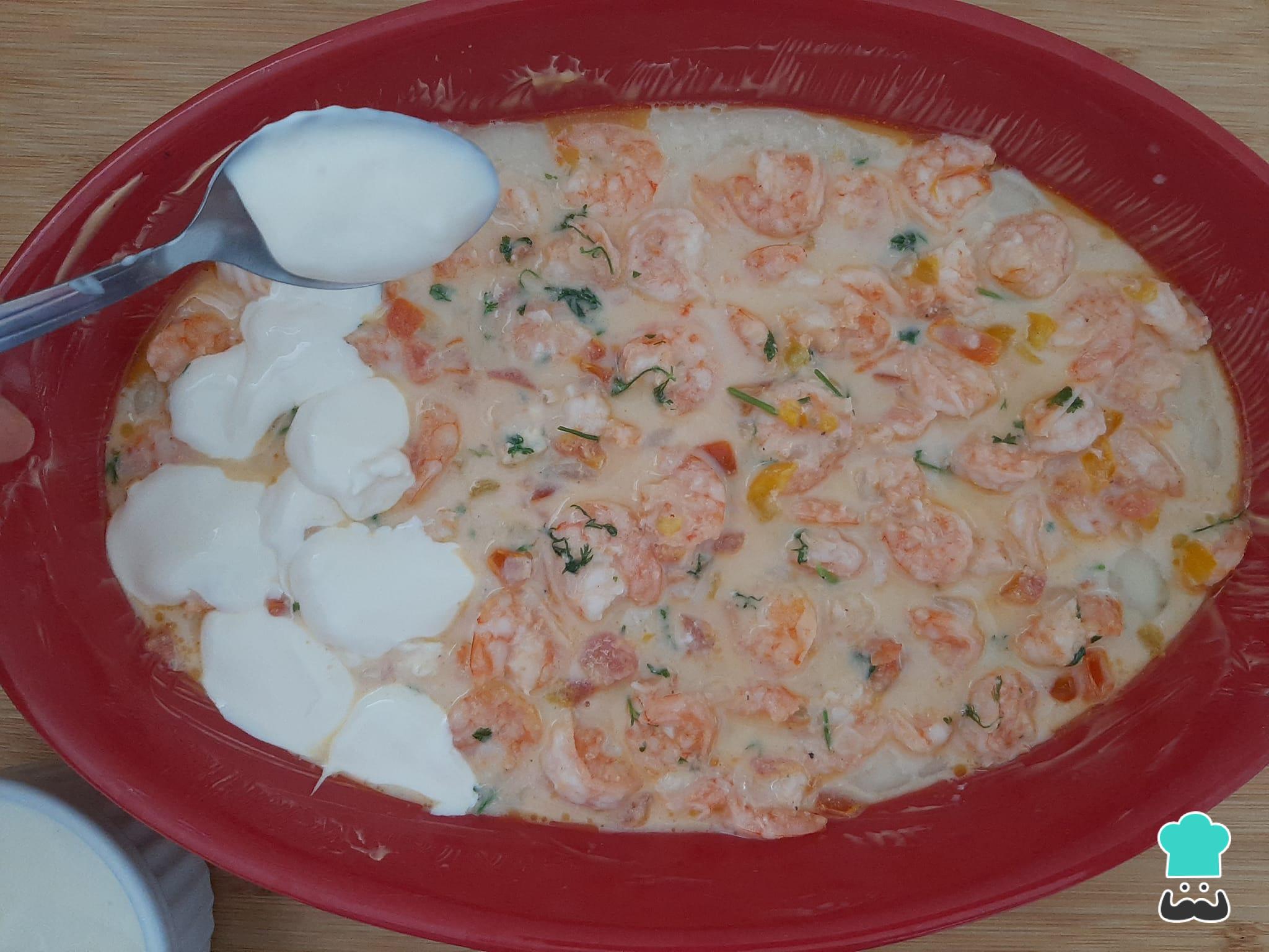 Acrescente o molho de camarões sobre essa camada de purê de aipim e cubra com catupiry (se não tiver usando a bisnaga, utilize uma colher).