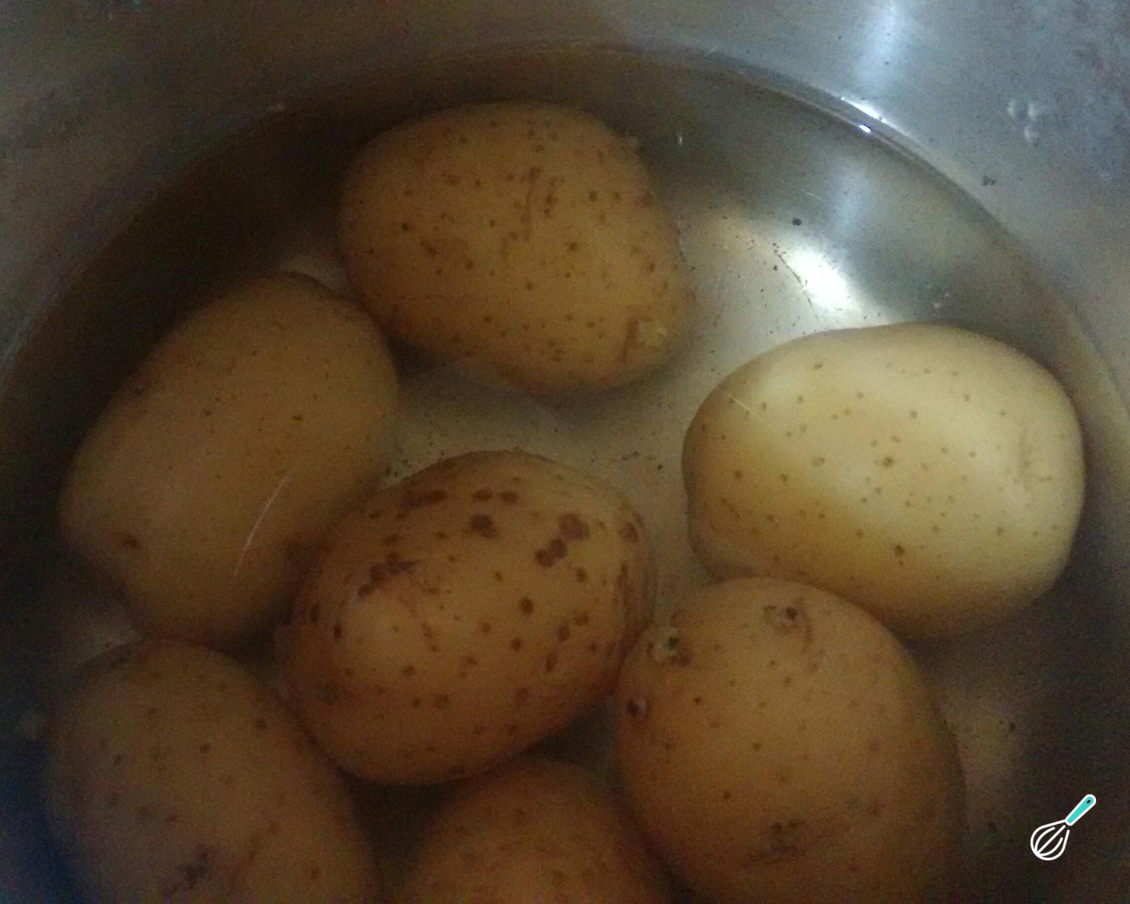 Em uma panela de pressão cozinhe as batatas sem descascar. Após começar a fazer pressão, espere uns 15 minutos e desligue o fogo, deixe a pressão sair.