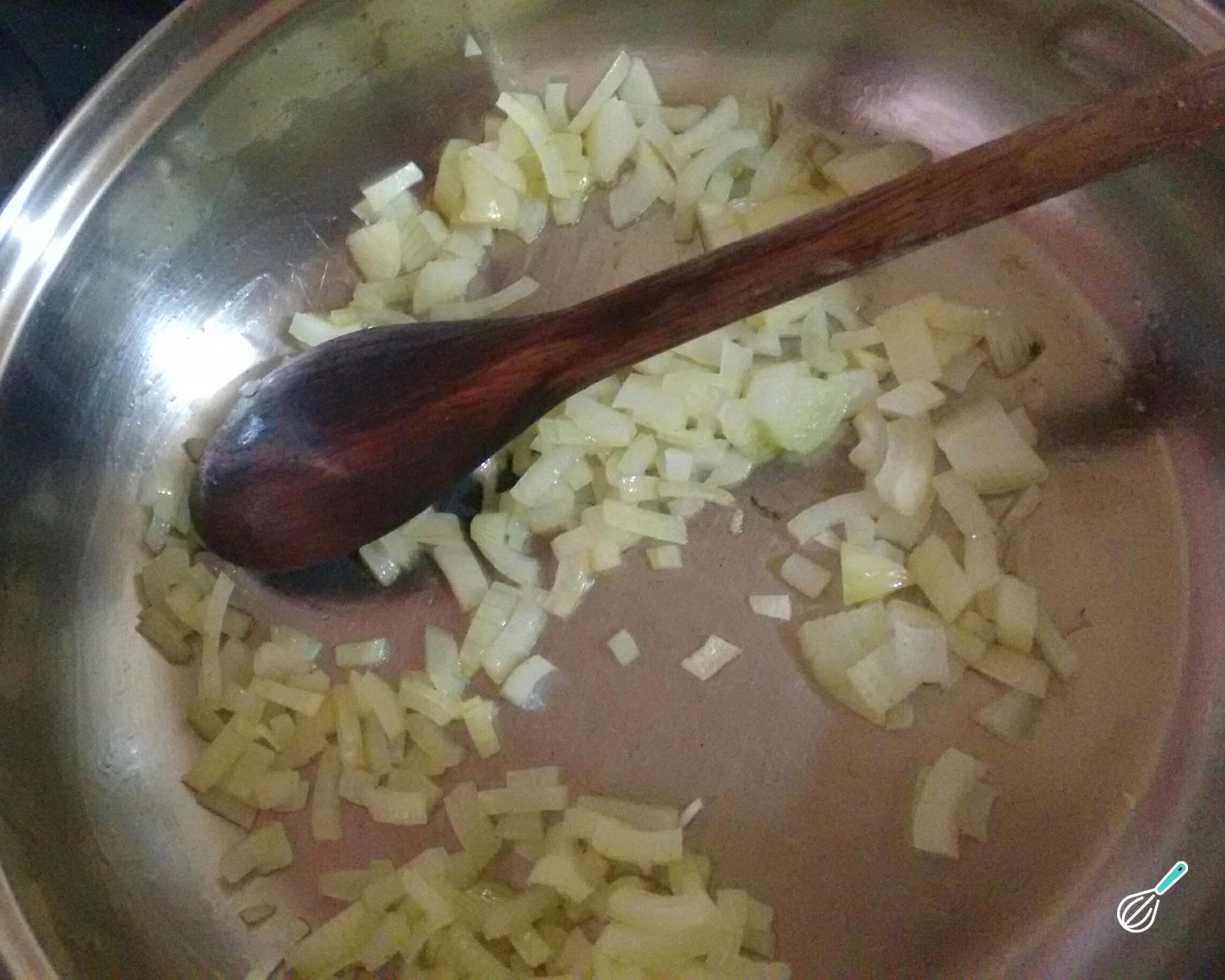 Continue preparando esta receita de escondidinho de carne moída com batata cremoso: numa frigideira grande coloque o azeite, a cebola e o alho. Refogue até a cebola ficar translúcida.