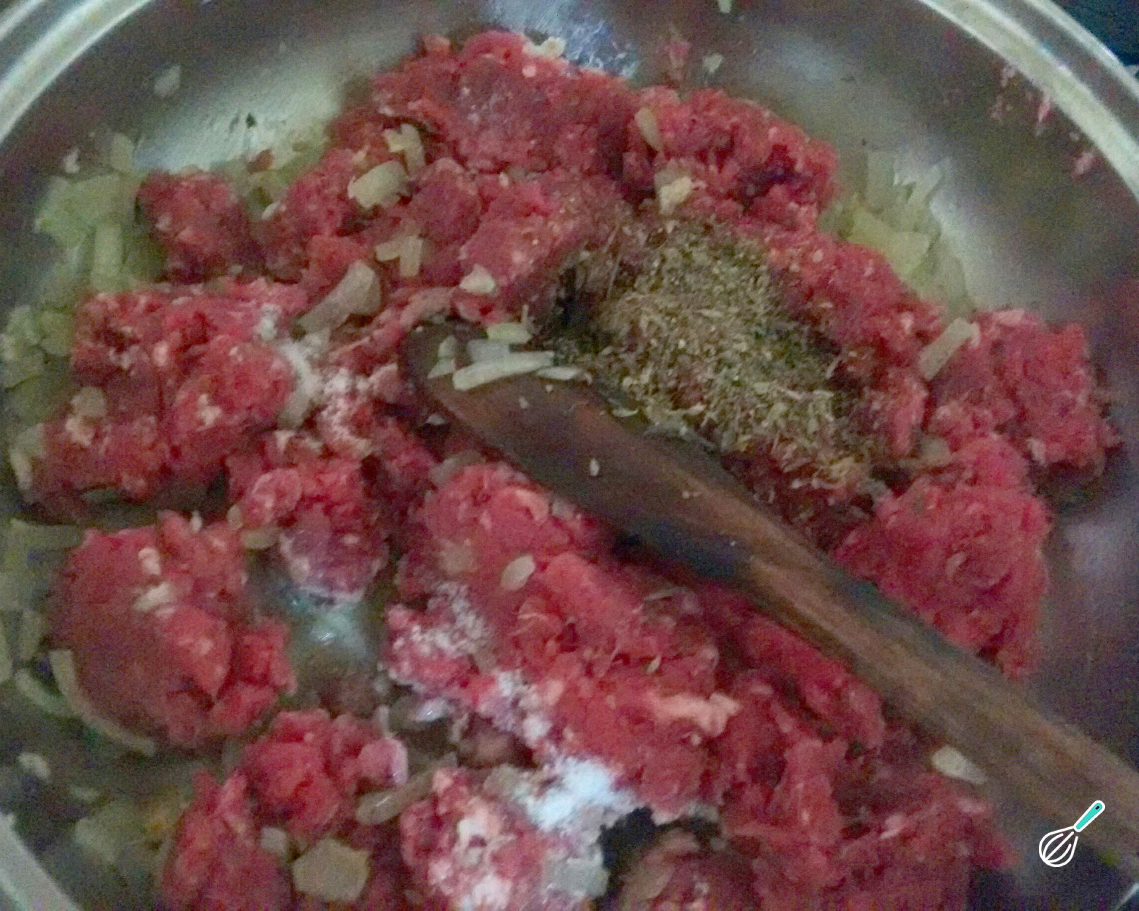 Acrescente a carne, o orégano e o manjericão e refogue bem, mexendo para conseguir uma carne moída soltinha.