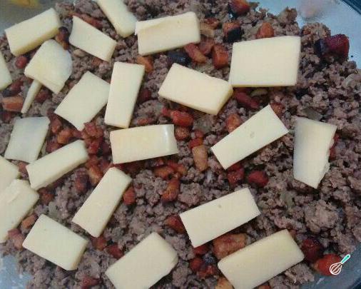 Em seguida coloque a carne moída e, sobre ela, distribua o queijo mussarela cortado em cubos e o bacon.