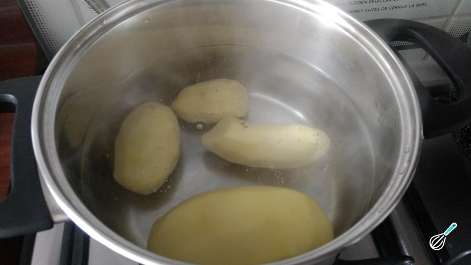 Descasque as batatas e lave-as muito bem. Coloque as batatas numa panela com água suficiente para cobri-las, adicione um pouco de sal e deixe ferver no fogo médio por 15 a 20 minutos.