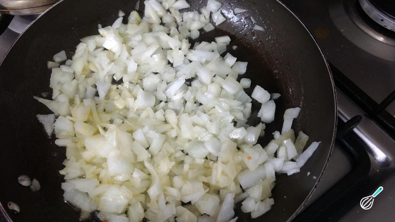 Enquanto isso, descasque a cebola e pique em pedacinhos. Leve ao fogo médio-baixo uma frigideira ou panela com um pouco de óleo e, quando estiver quente, frite a cebola até ficar macia.