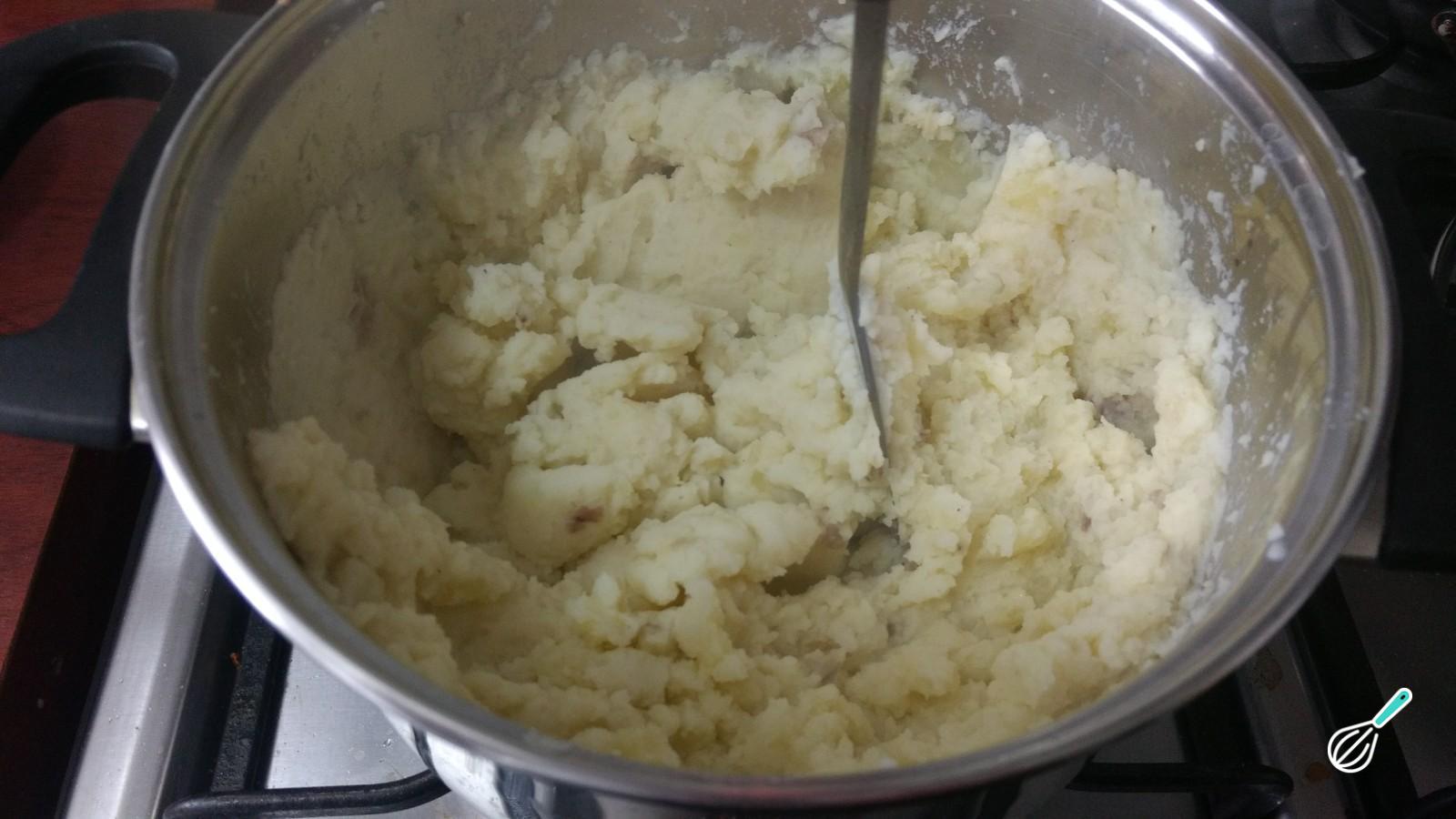Quando as batatas estiverem macias, escorra a água e adicione-lhes a manteiga, o sal e o leite. Amasse as batatas com um garfo ou com um acessório próprio.