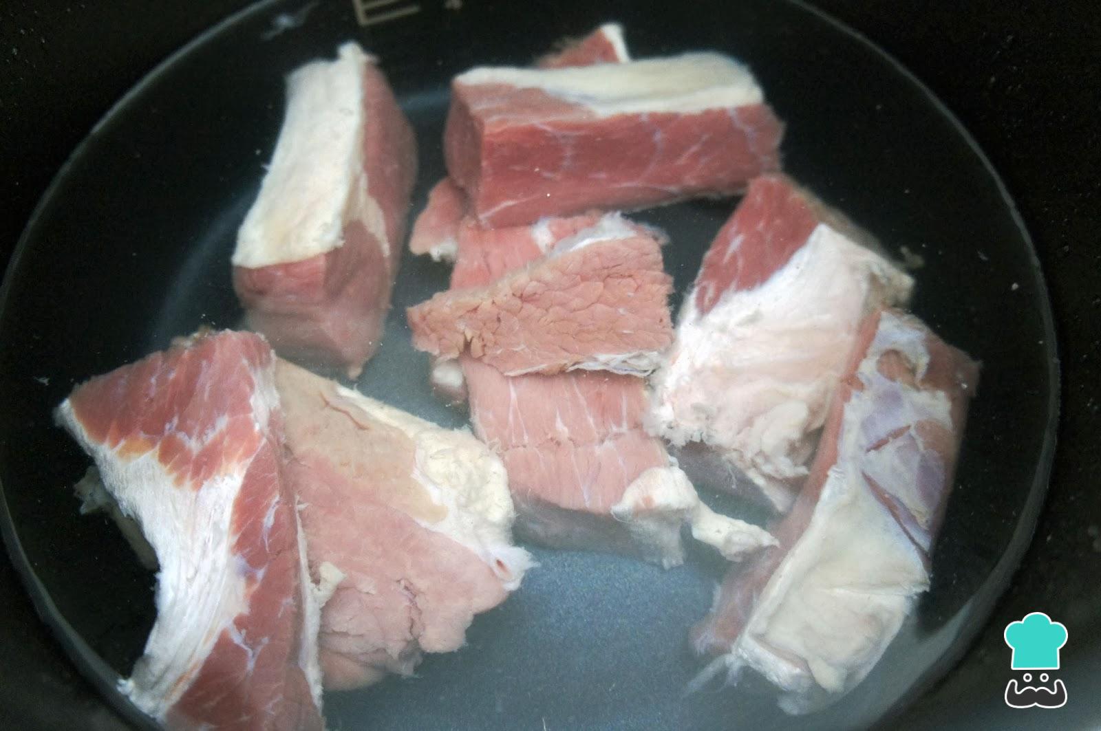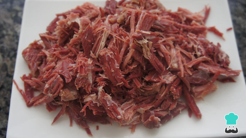 O primeiro passo do escondidinho de charque é cozinhar o charque. Para isso coloque a carne cortada em pedaços em uma panela com água e leve ao fogo médio. Cozinhe até a carne ficar macia.