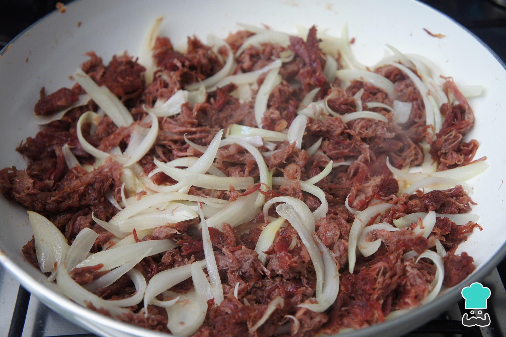 Numa frigideira com um pouco de azeite, refogue a cebola picada ou cortada em rodelas, até que fique translúcida. Acrescente a carne e cozinhe por 1-2 minutos, tempere com sal e pimenta do reino a gosto.