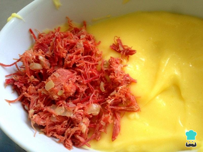 Quando a carne e batata deste escondidinho de charque estiverem cozinhadas, escorra a água e deixe amornar. Desfie a carne e reduza as batatas a purê, adicionando-lhes um pouco de pimenta do reino.