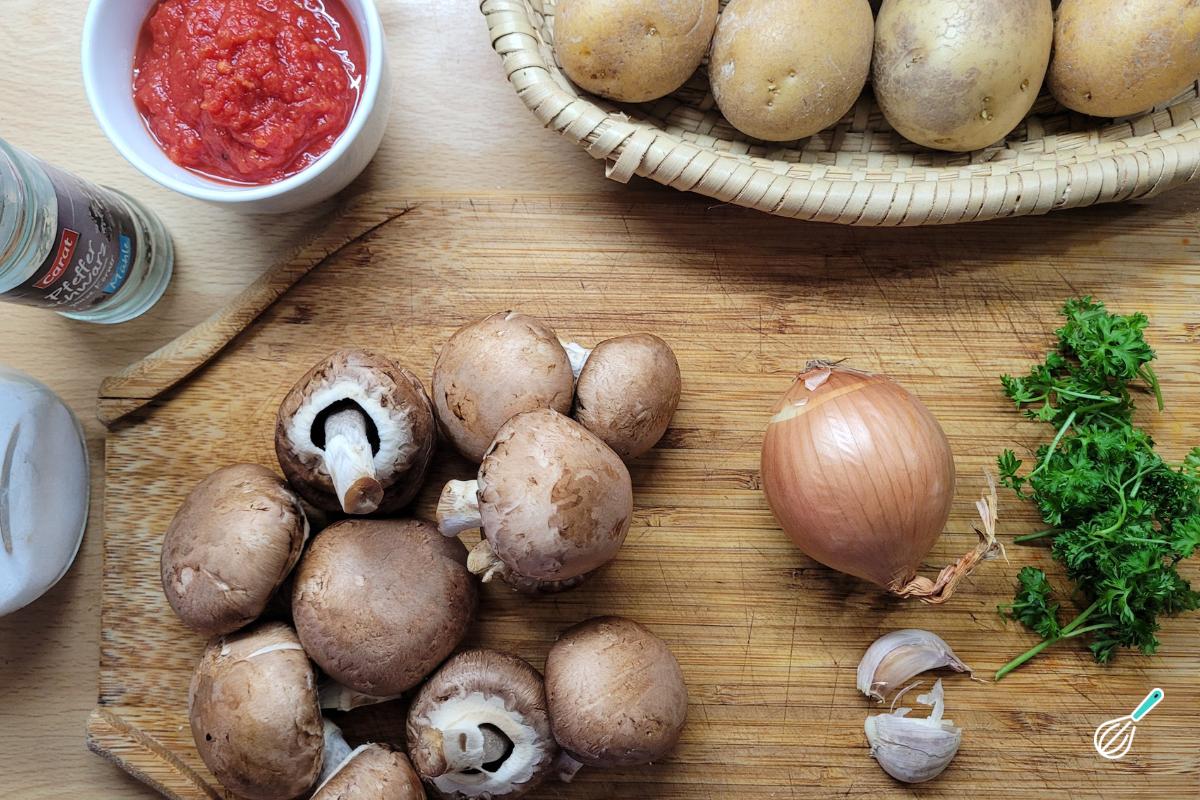 Separe os ingredientes para fazer seu escondidinho de cogumelos. Aqui usei cogumelos portobello, mas pode fazer com qualquer tipo de cogumelo.