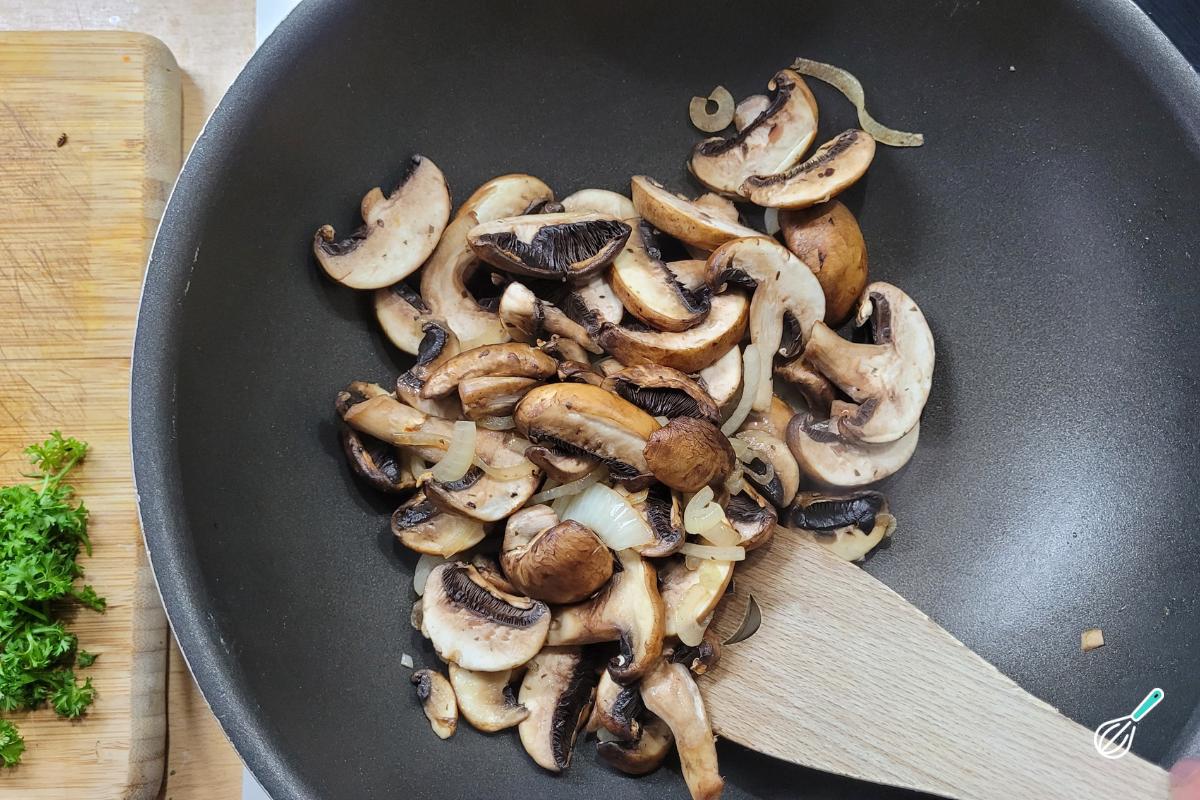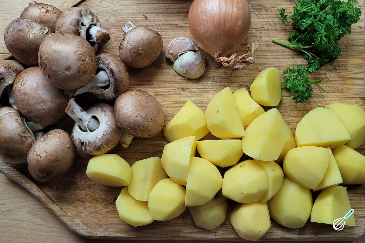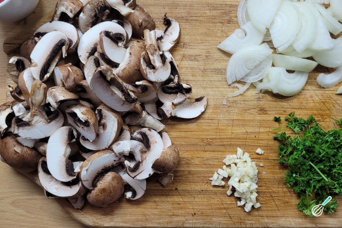 Enquanto as batatas cozinham, vamos preparar o recheio. Corte os cogumelos em fatias, as cebolas em meias luas e o alho em cubinhos. Pique também a salsinha.