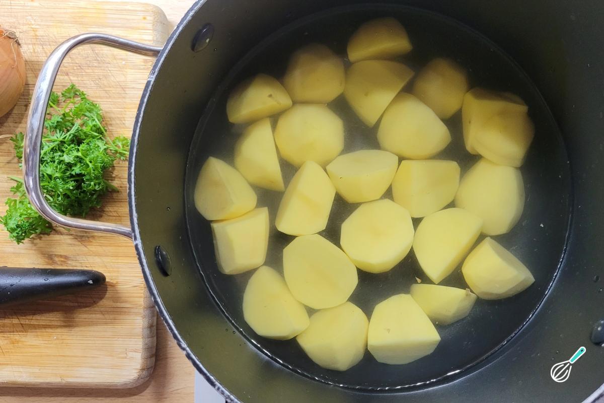Corte as batatas em pedaços médios. Não precisa se preocupar em cortar em pedaços muito uniformes, pois vamos amassar a batata, mas o ideal é que sejam pedaços mais ou menos de mesmo tamanho para que cozinhem no mesmo tempo.